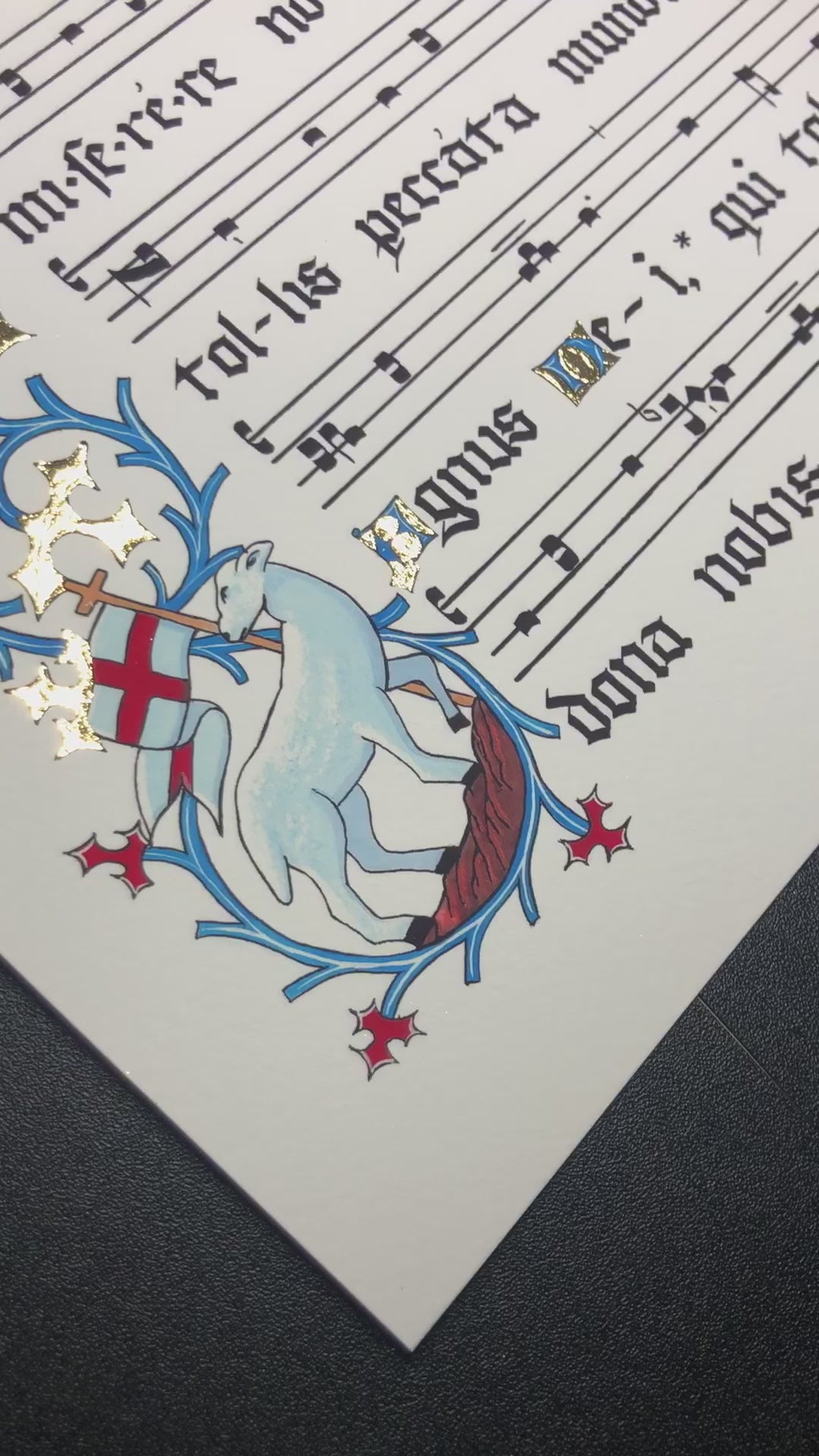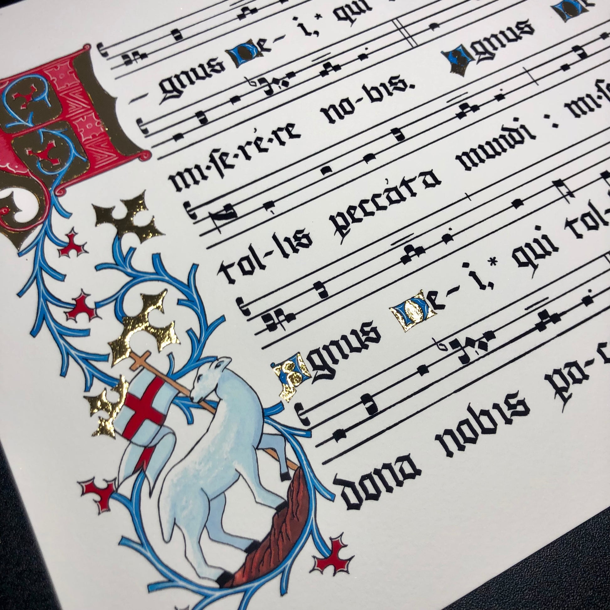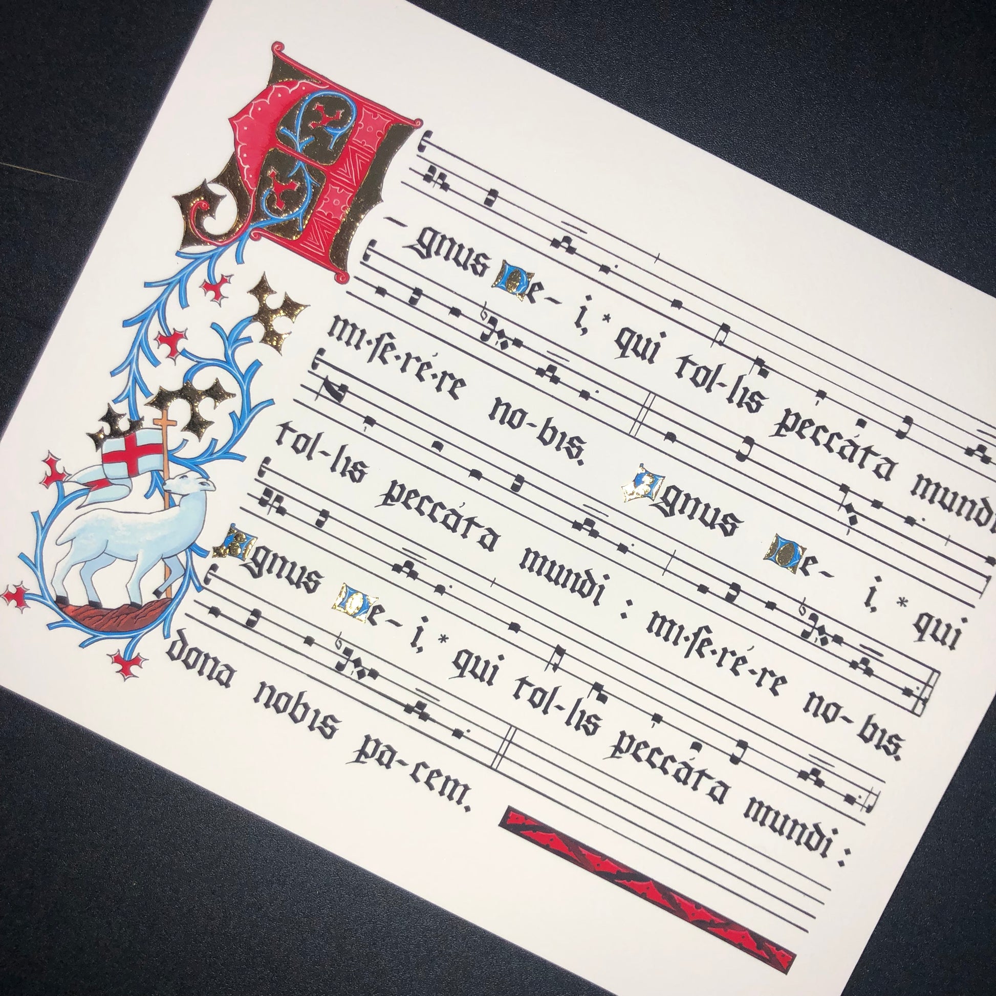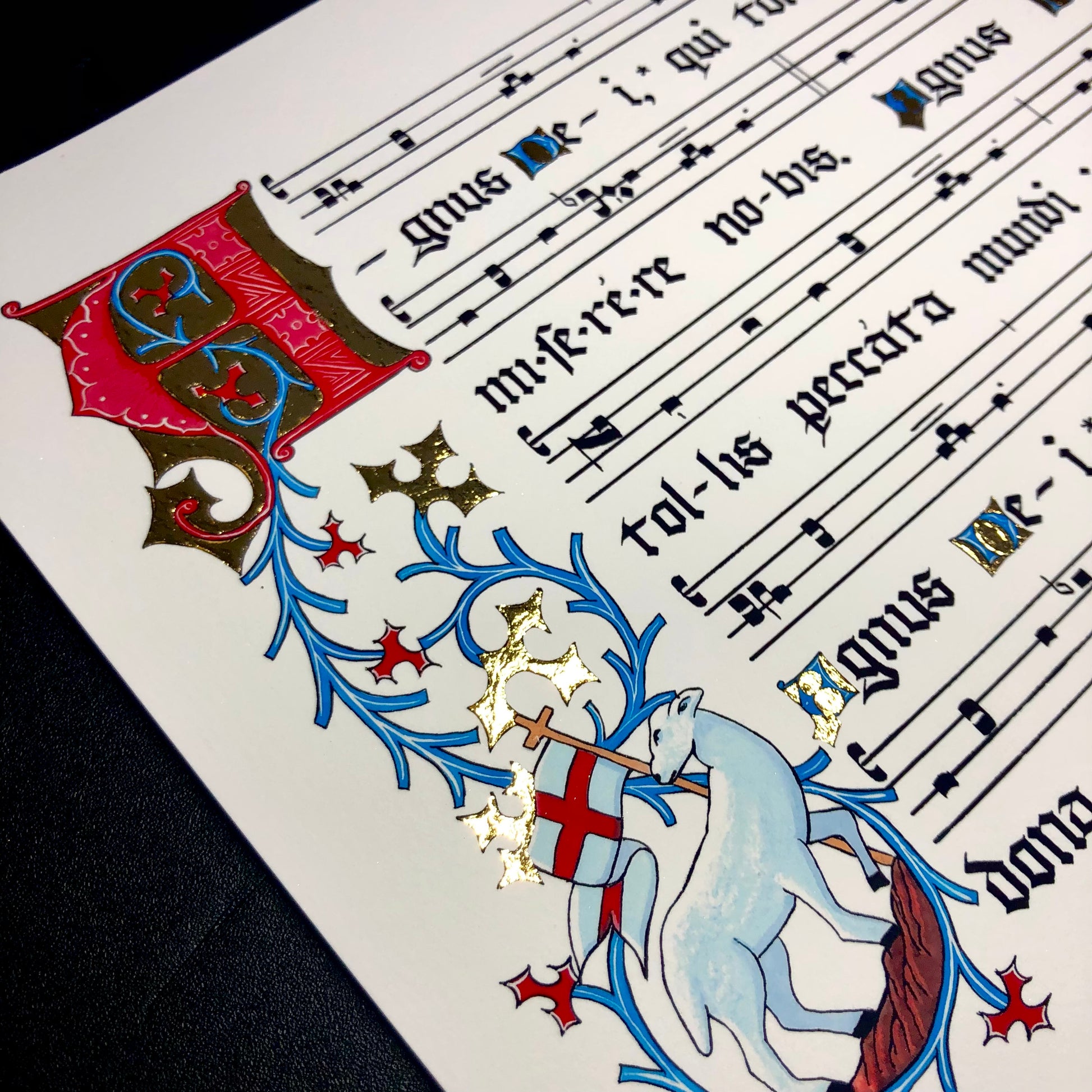 This 'Agnus Dei' is probably my favorite Gregorian Chant piece that I've created to date. A magnificent illuminated red and gold initial 'A' is accompanied by twisting blue vines and an illustration of the Lamb of God, standing boldly and majestically, having conquered sin and death. The text of the prayer itself is set to the beloved Missa de Angelis, elevating the prayer with song.