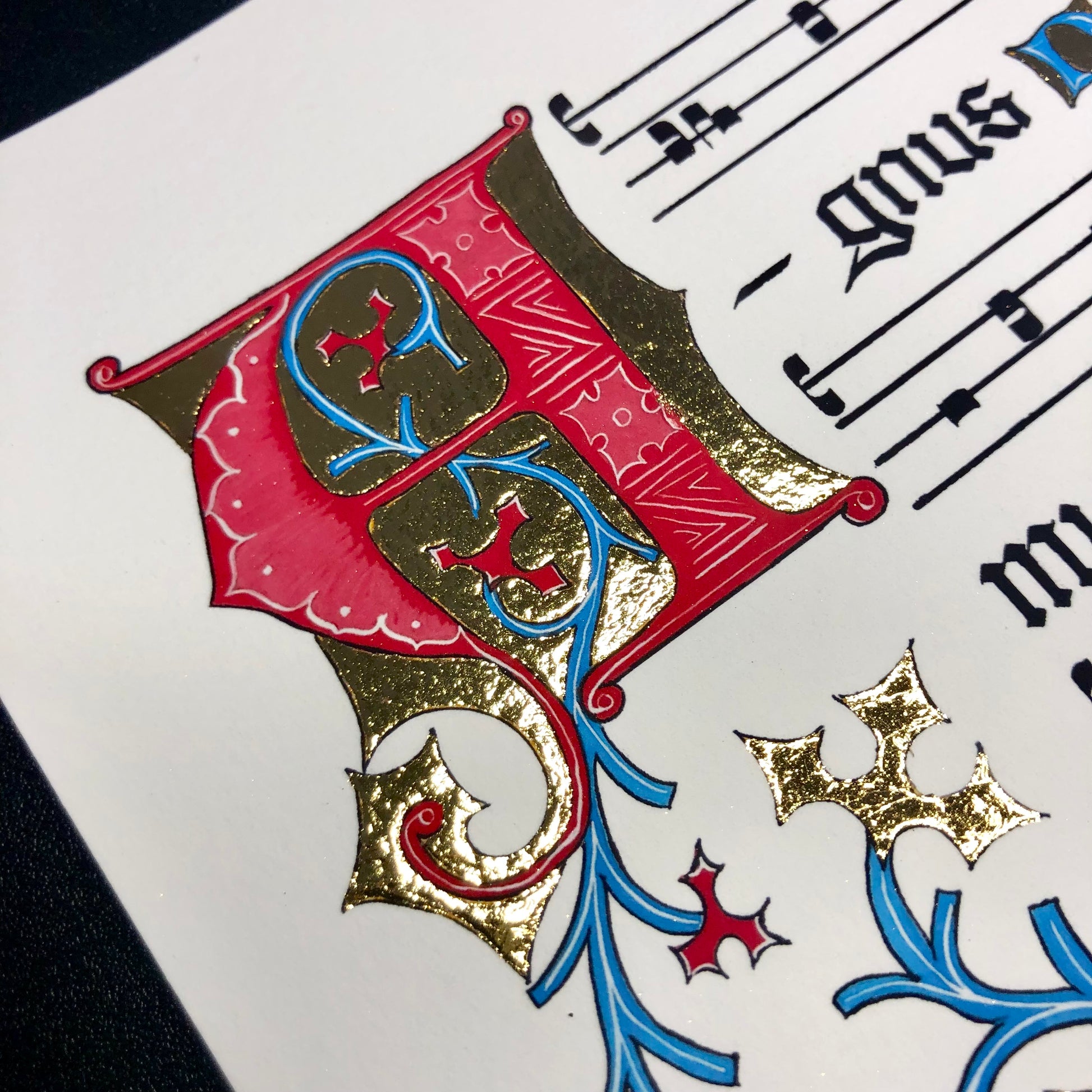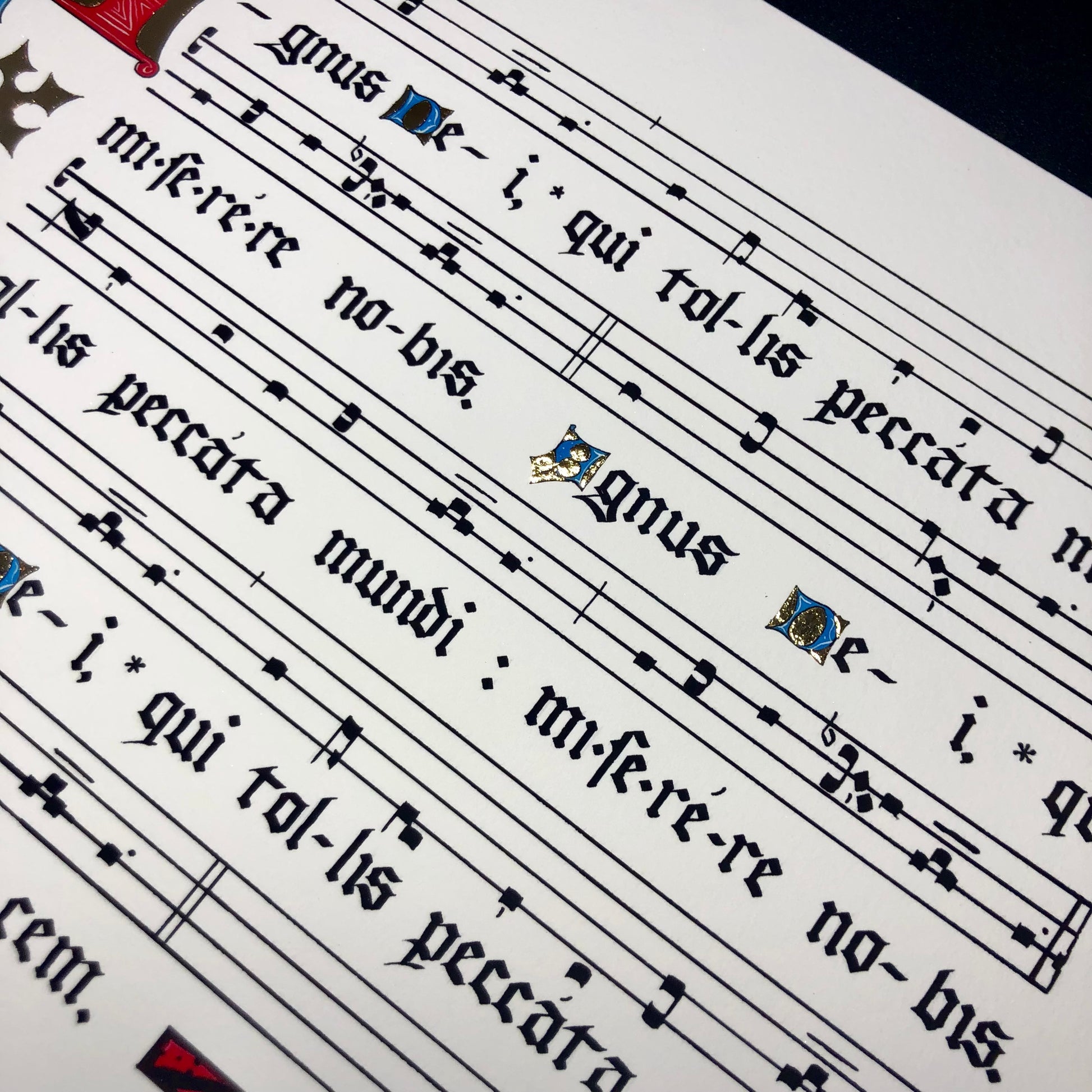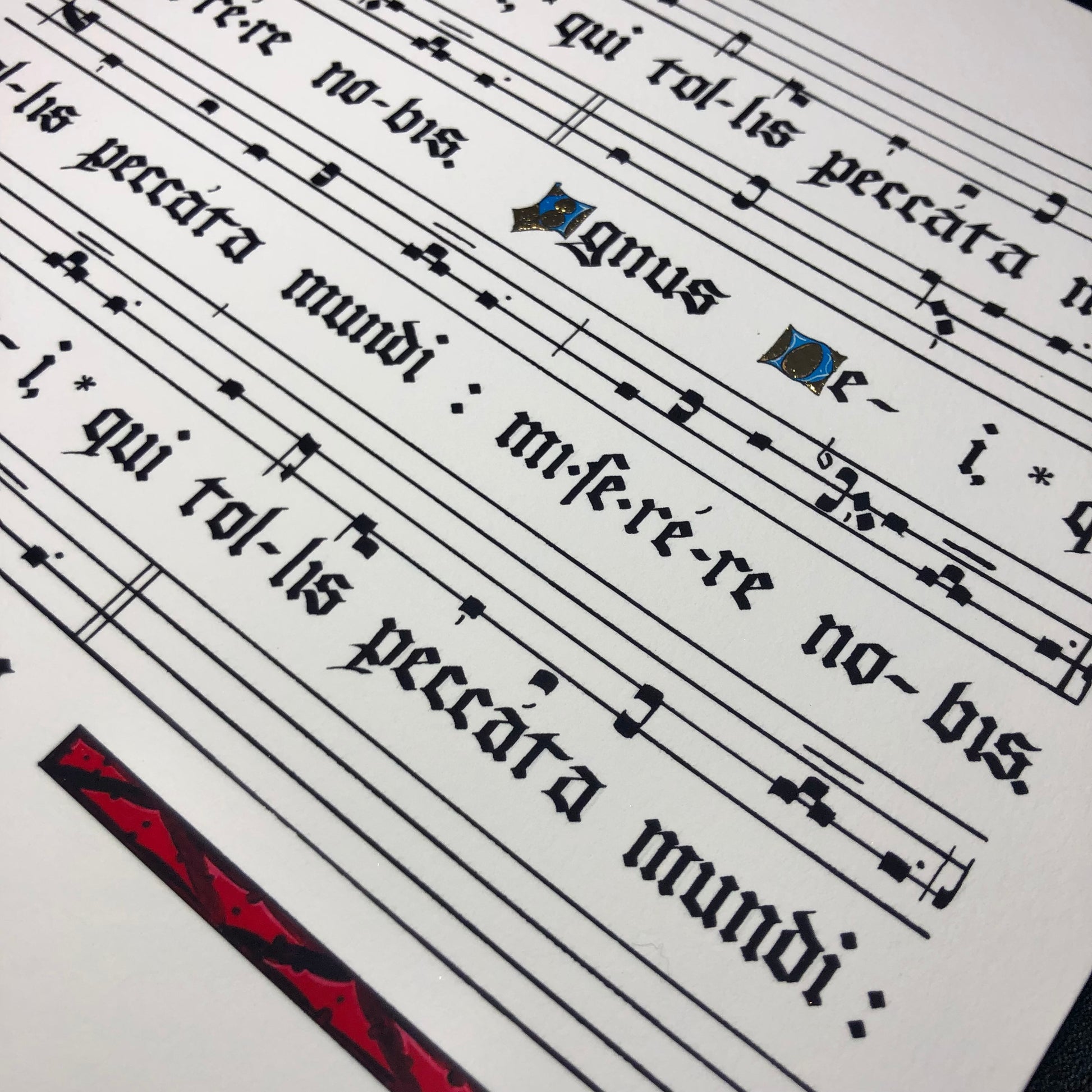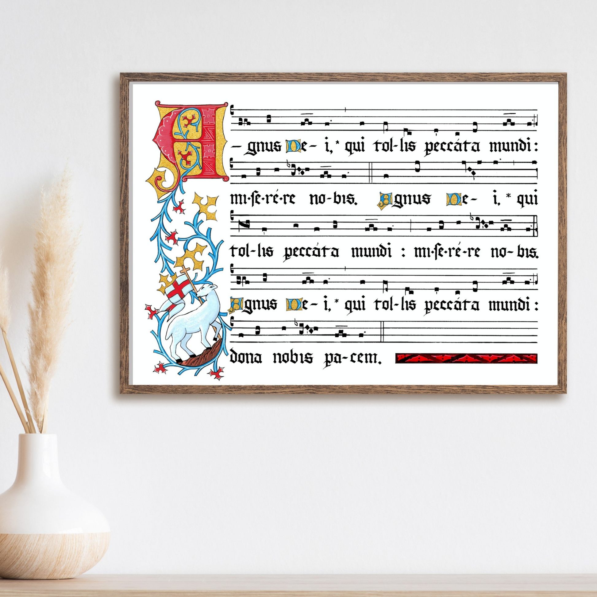 This 'Agnus Dei' is probably my favorite Gregorian Chant piece that I've created to date. A magnificent illuminated red and gold initial 'A' is accompanied by twisting blue vines and an illustration of the Lamb of God, standing boldly and majestically, having conquered sin and death. The text of the prayer itself is set to the beloved Missa de Angelis, elevating the prayer with song.
