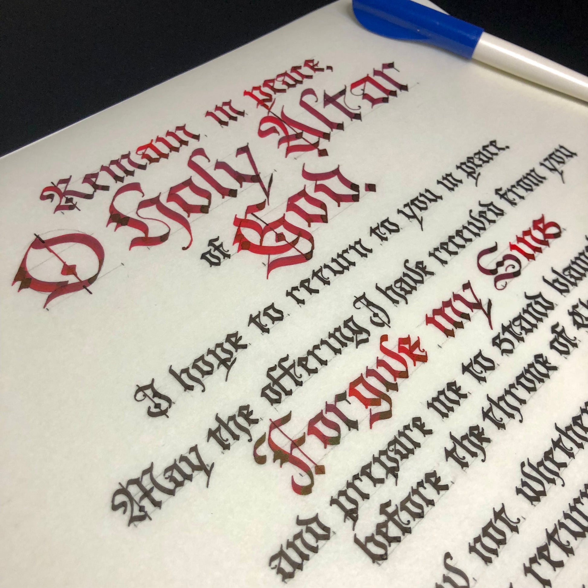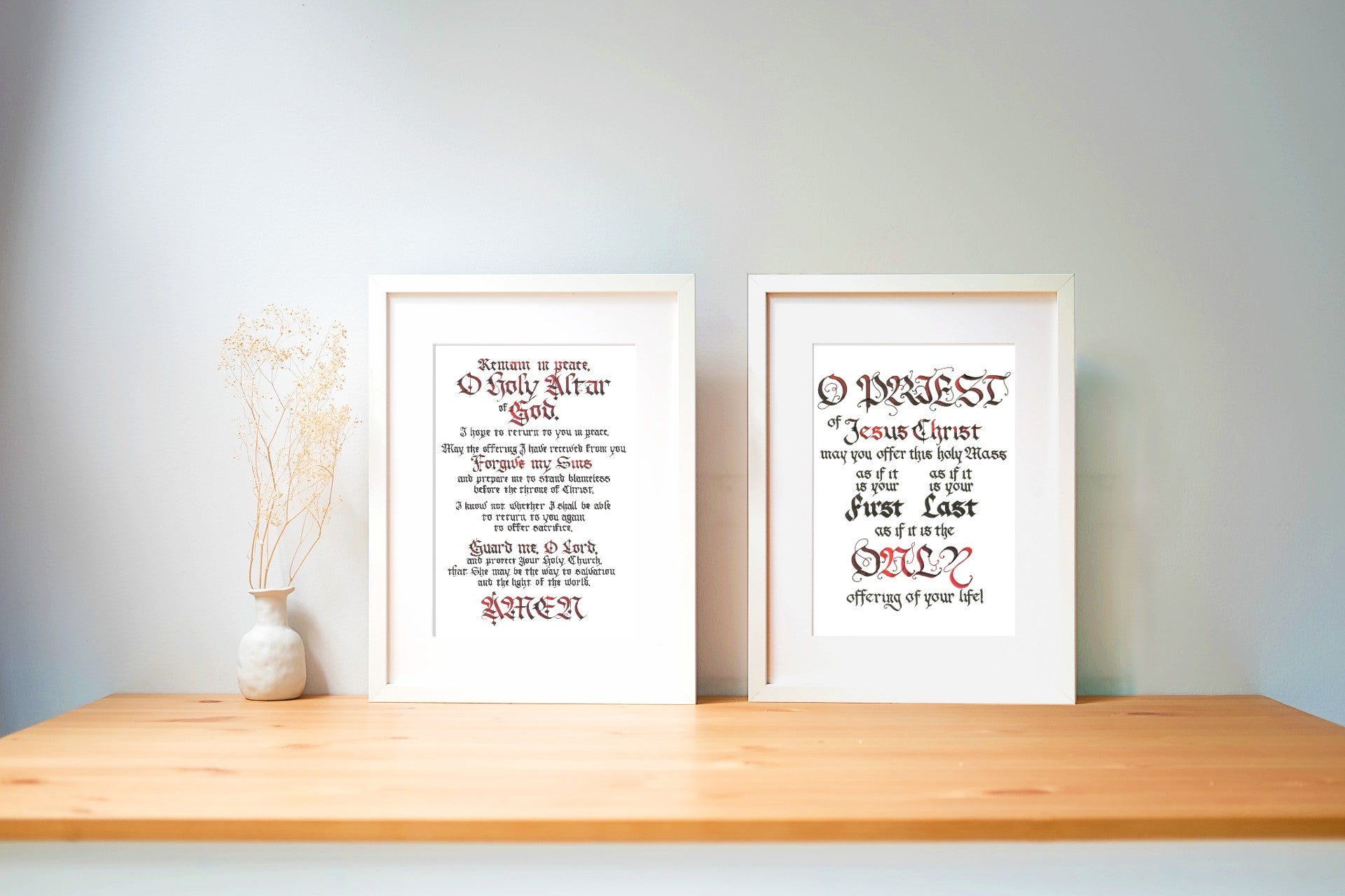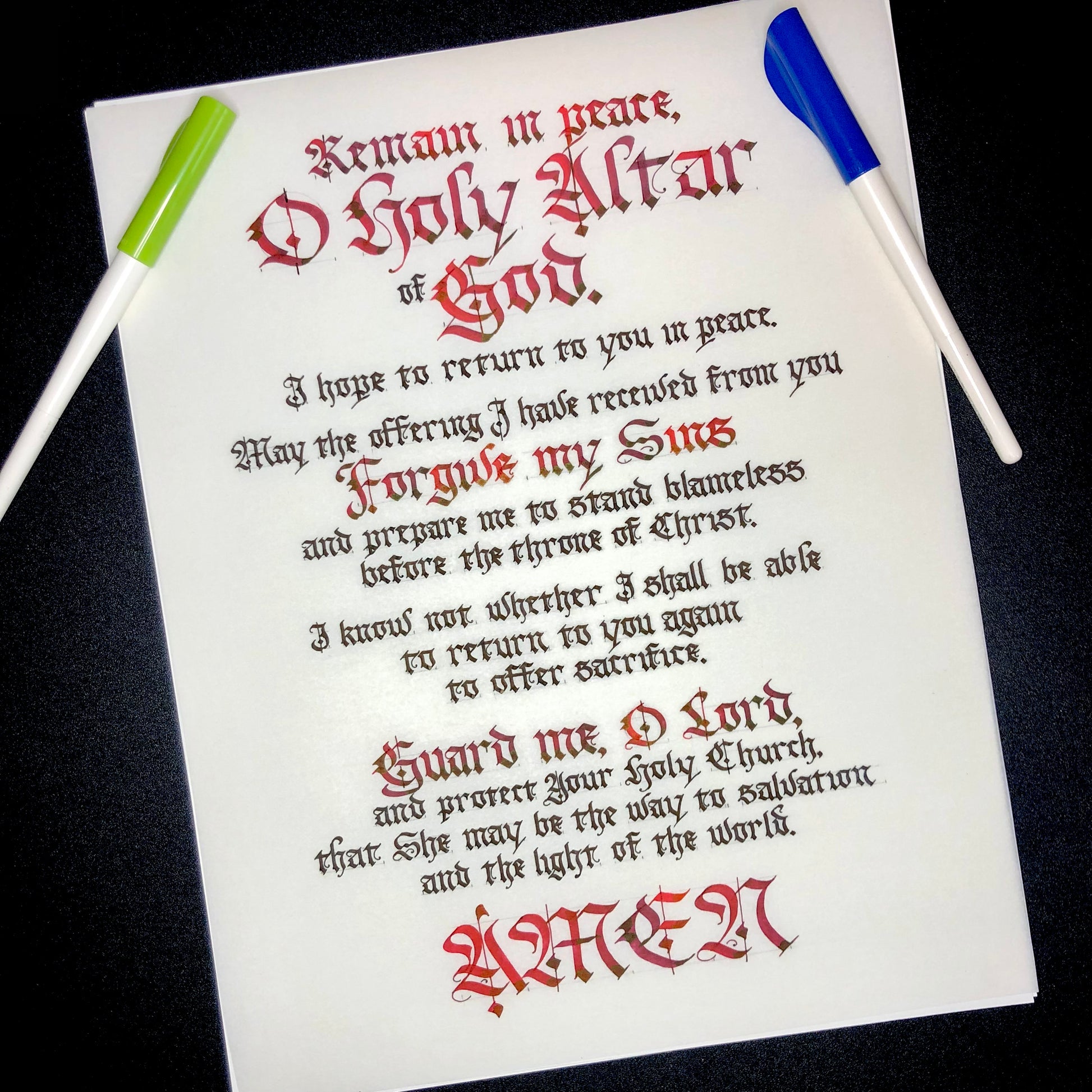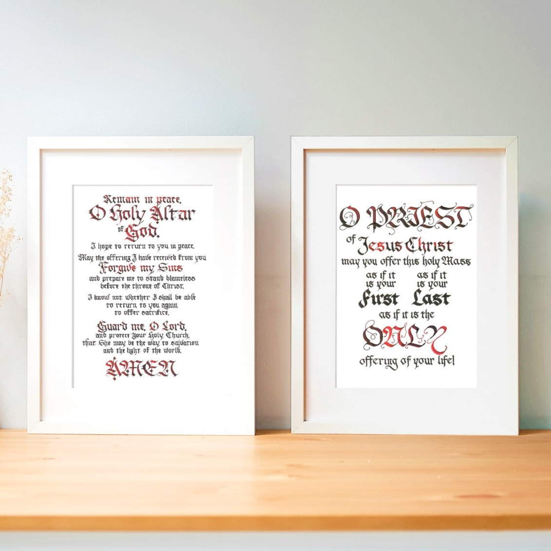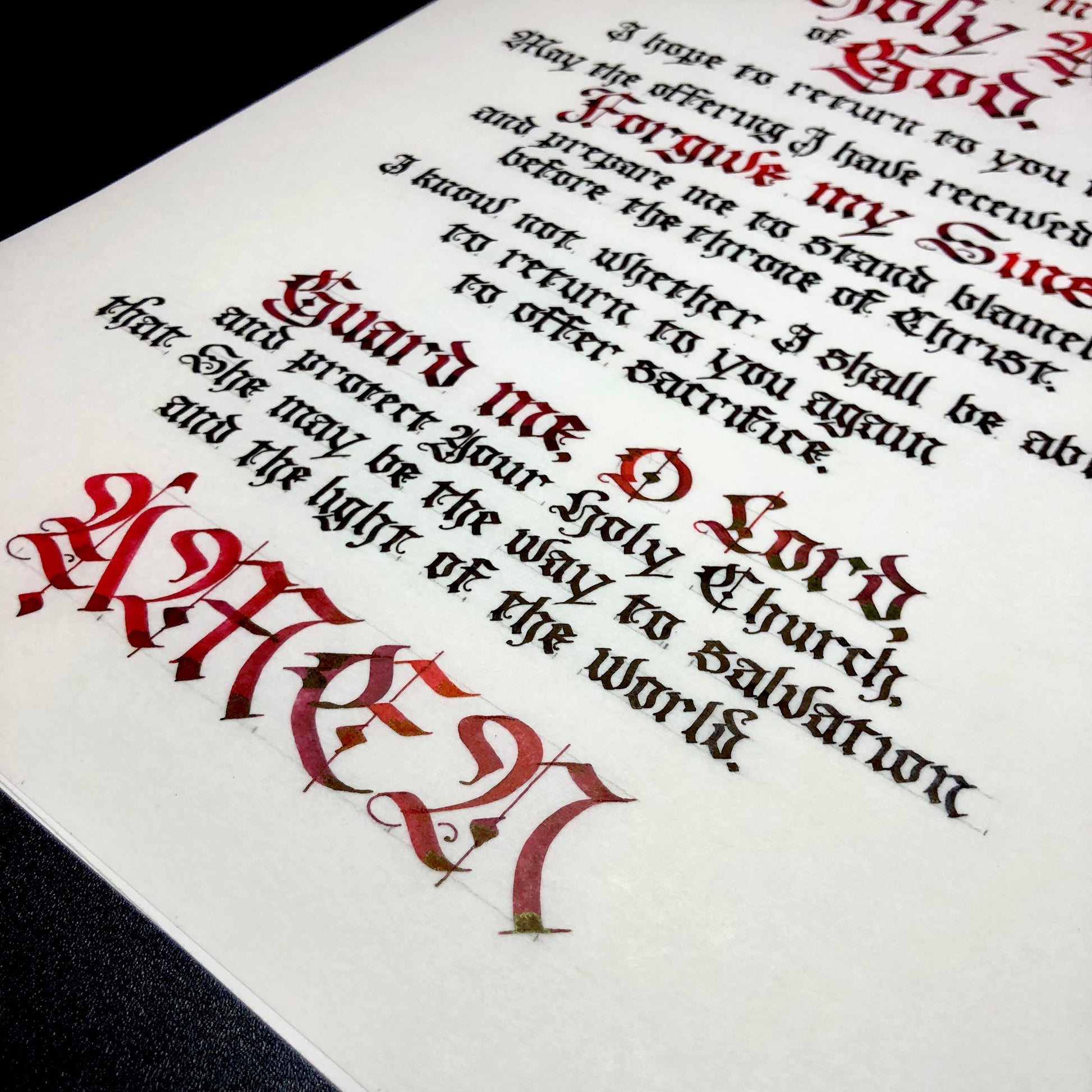 This bundle collects two beautiful prayers - a Preparation for Mass and Farewell to the Altar, prayed by the priest before and after Mass. Handwritten in my signature Blackletter/Fraktur calligraphy, the prayer cards may be used by the priest or a layperson to enter more deeply into the Mass, and joyfully await the next.