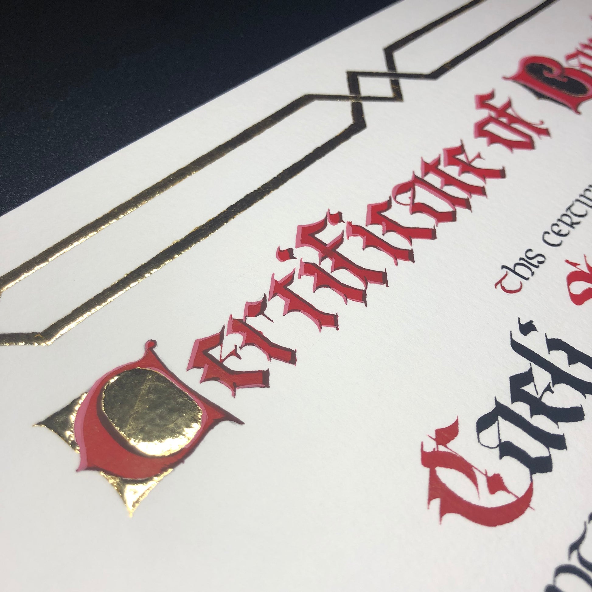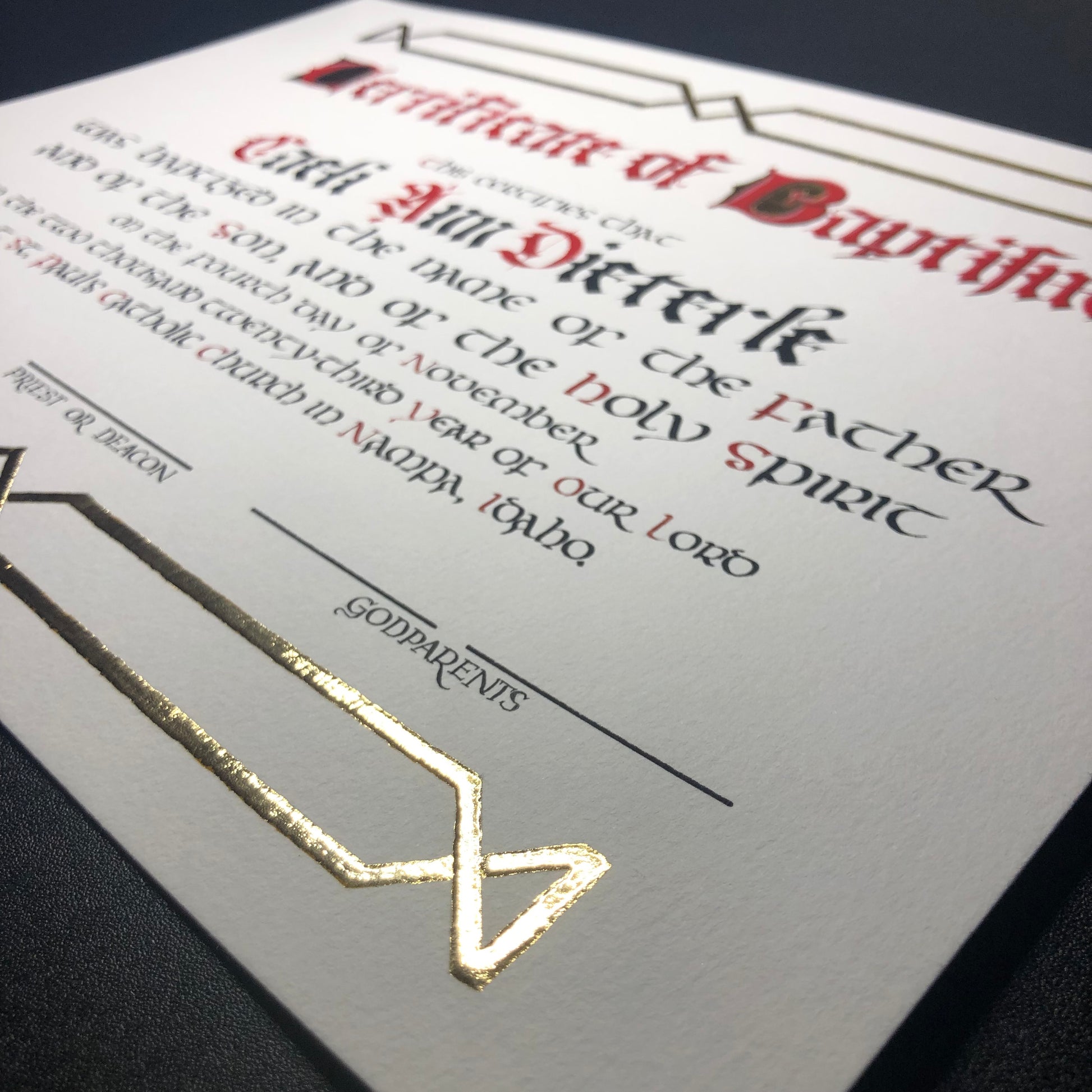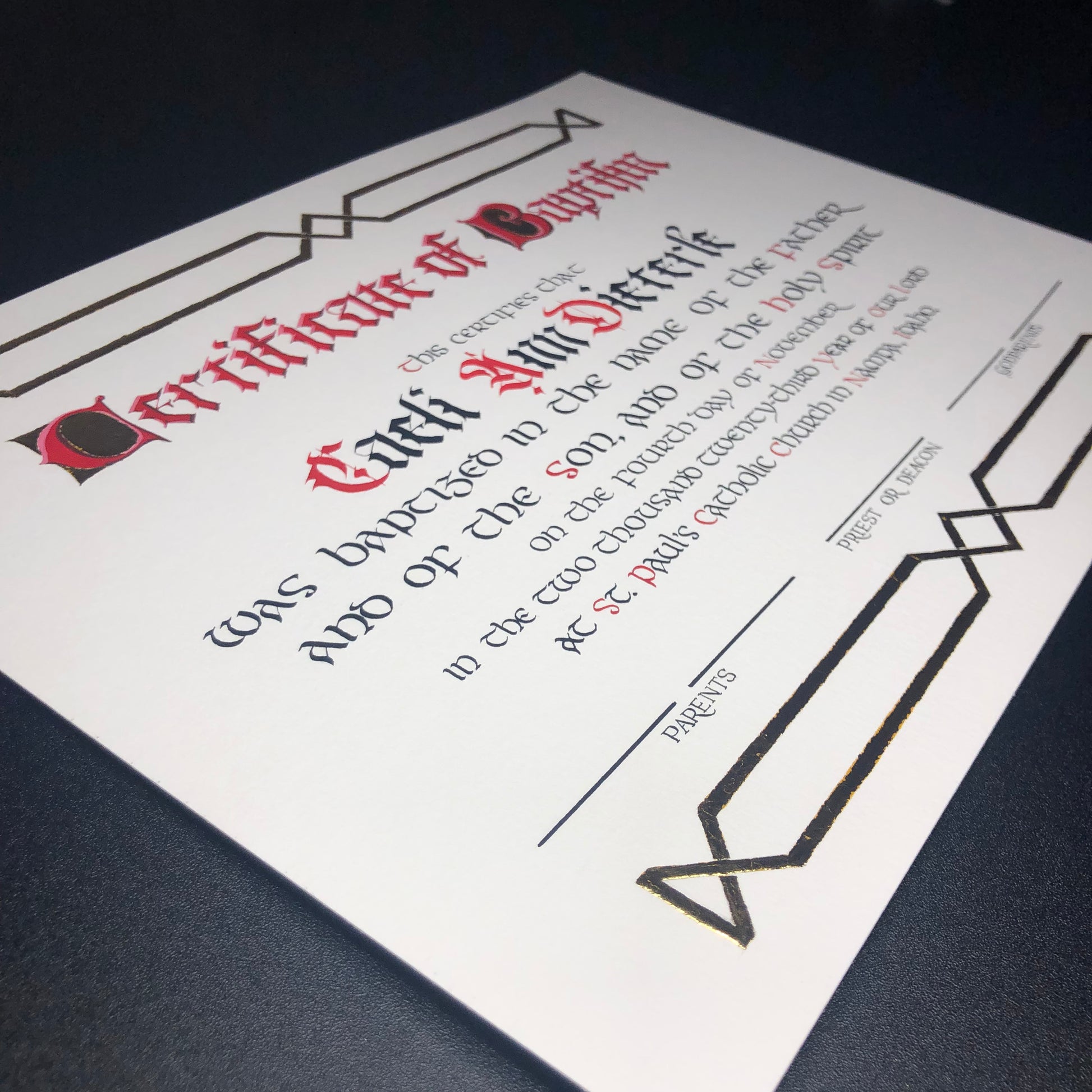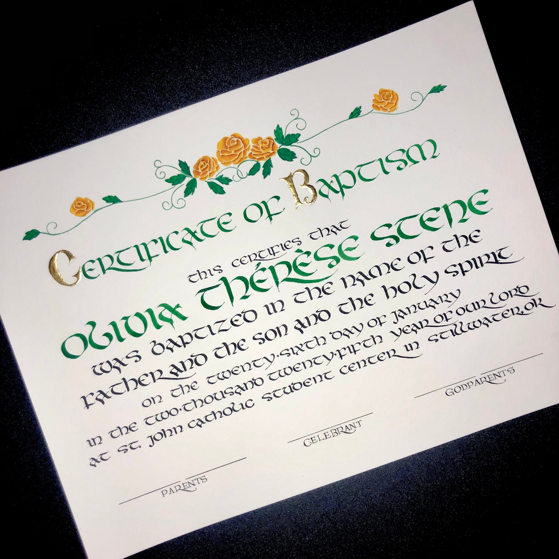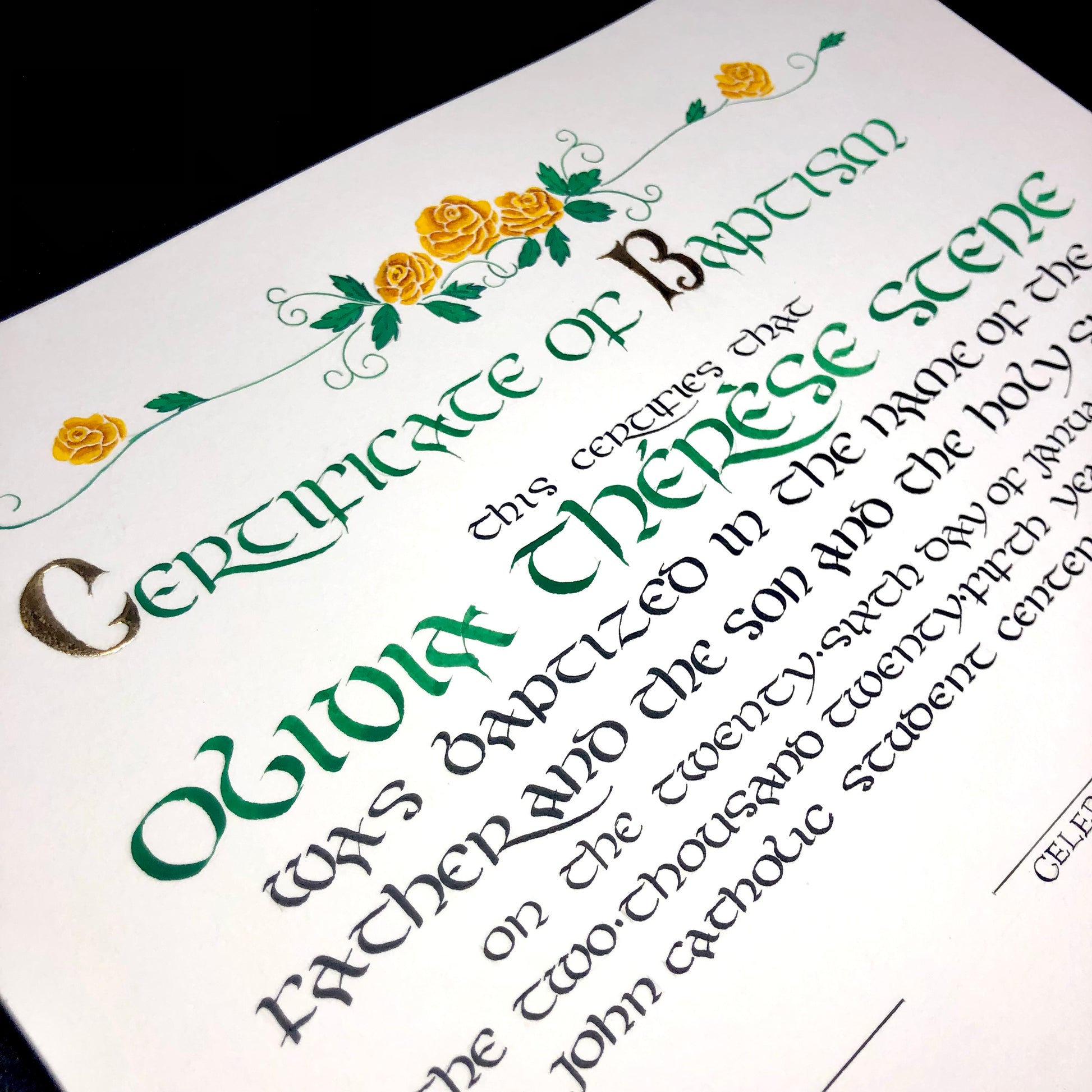 - Clark - Written and illuminated in a mix of Gothic and Celtic styles; the title of the Sacrament, 'Baptism', colorfully and magnificently illuminated in large letters. Includes a verse of Scripture of your choice. Note: Pictured sample is a Matrimony certificate.