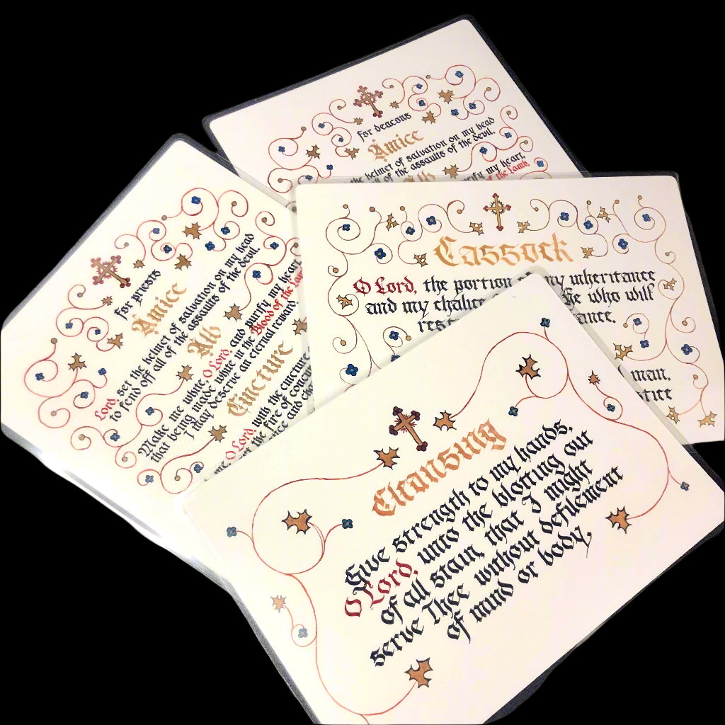 This bundle collects my most popular items - Vesting and Handwashing Prayers for the celebrating Priests, Deacons, and Altar Servers - into one neat package. All prints are laminated so that they may be easily handled and practically prayed by those in the sacristy. The set includes one each of: