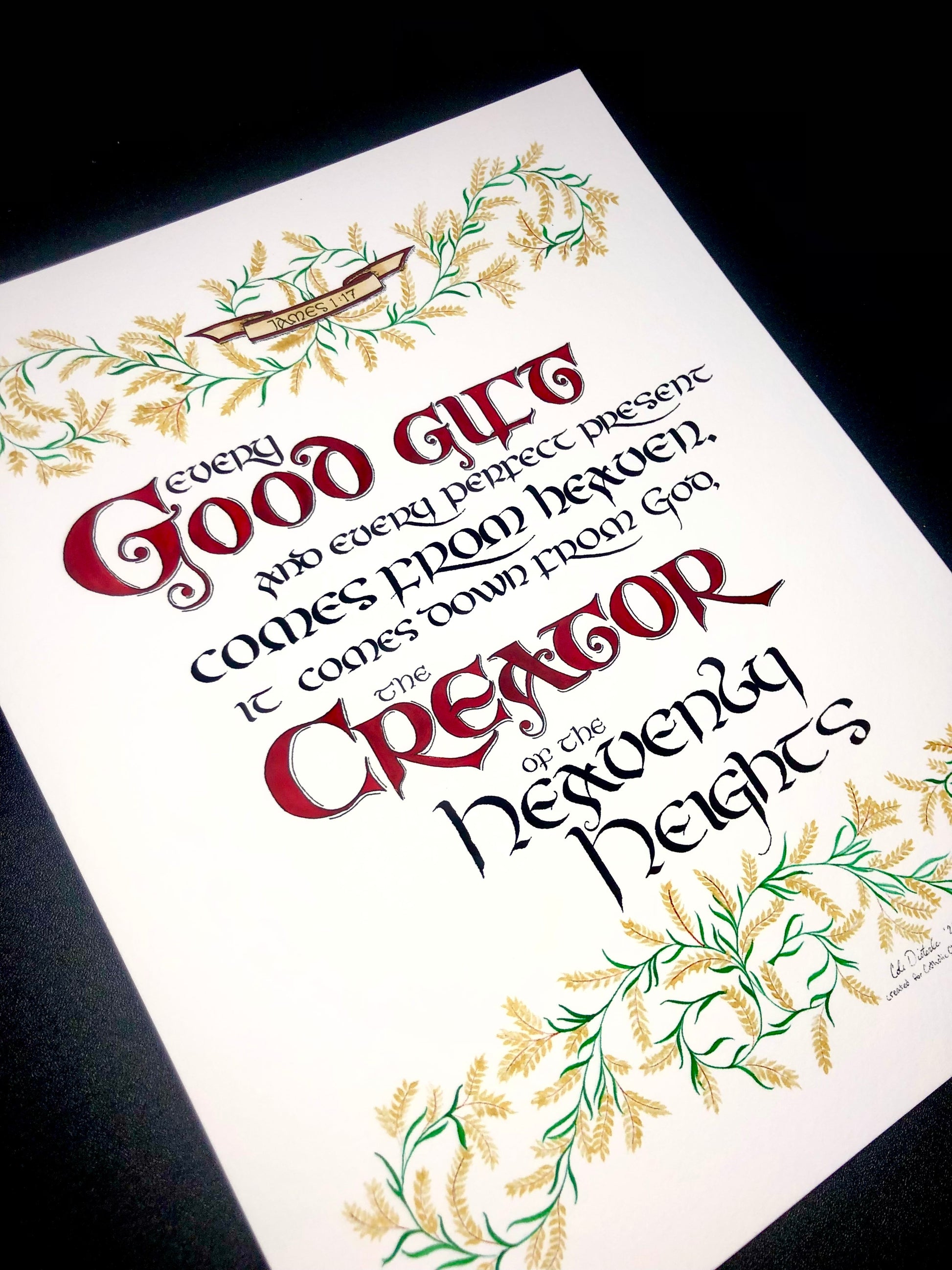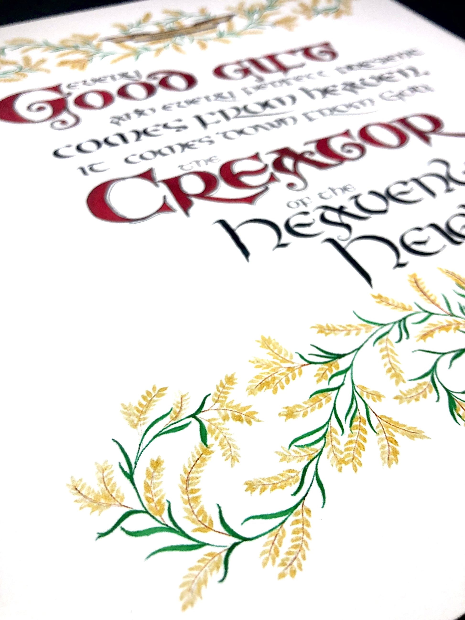 The scripture—"Every good gift and every perfect present comes from Heaven. It comes down from God, the Creator of the Heavenly Heights."—is written in a refined calligraphy style influenced by traditional Celtic scripts. The top and bottom of the piece are adorned with flowing green grass and golden wheat, symbolizing the fruitfulness of God's grace and providence.