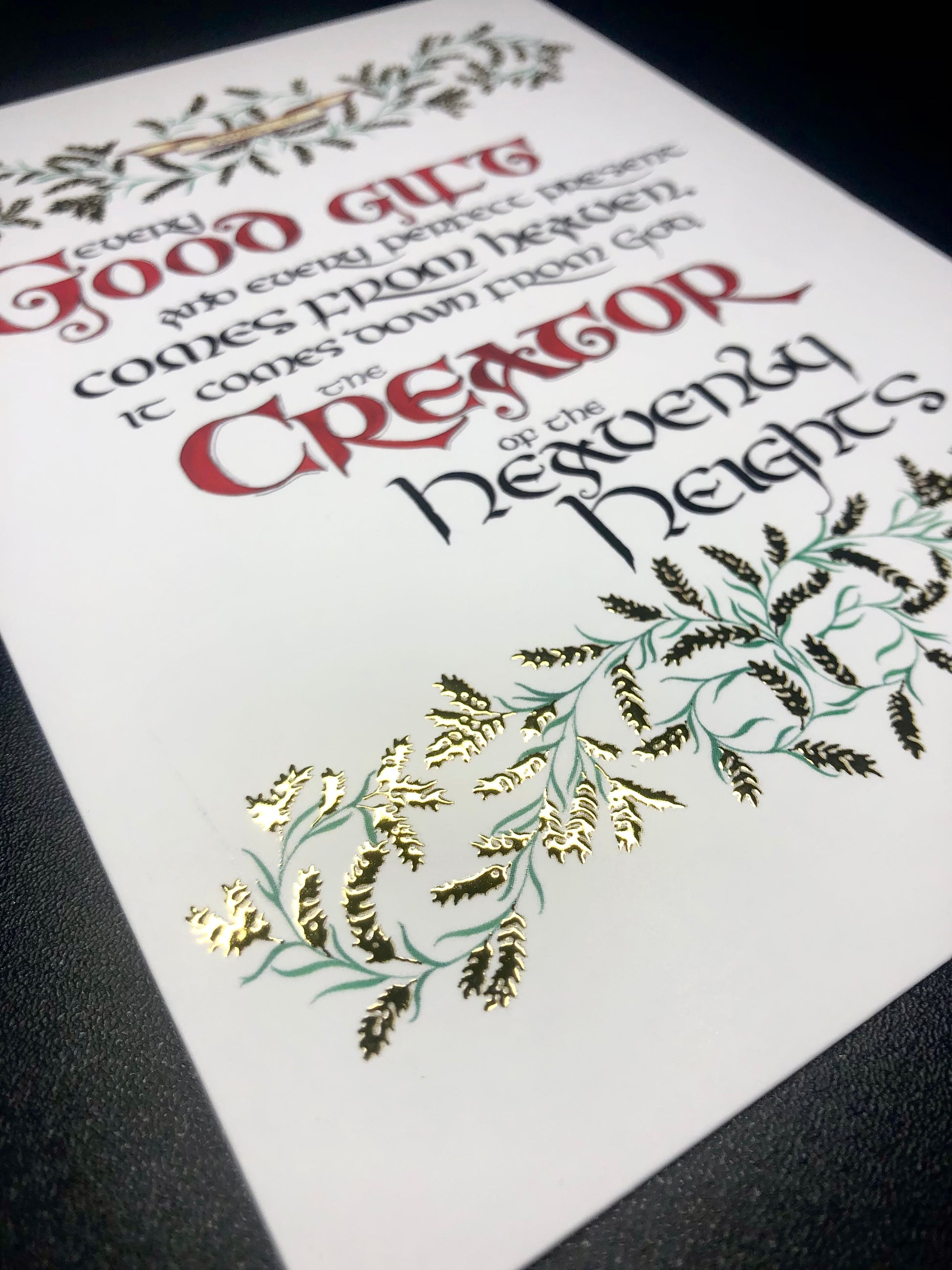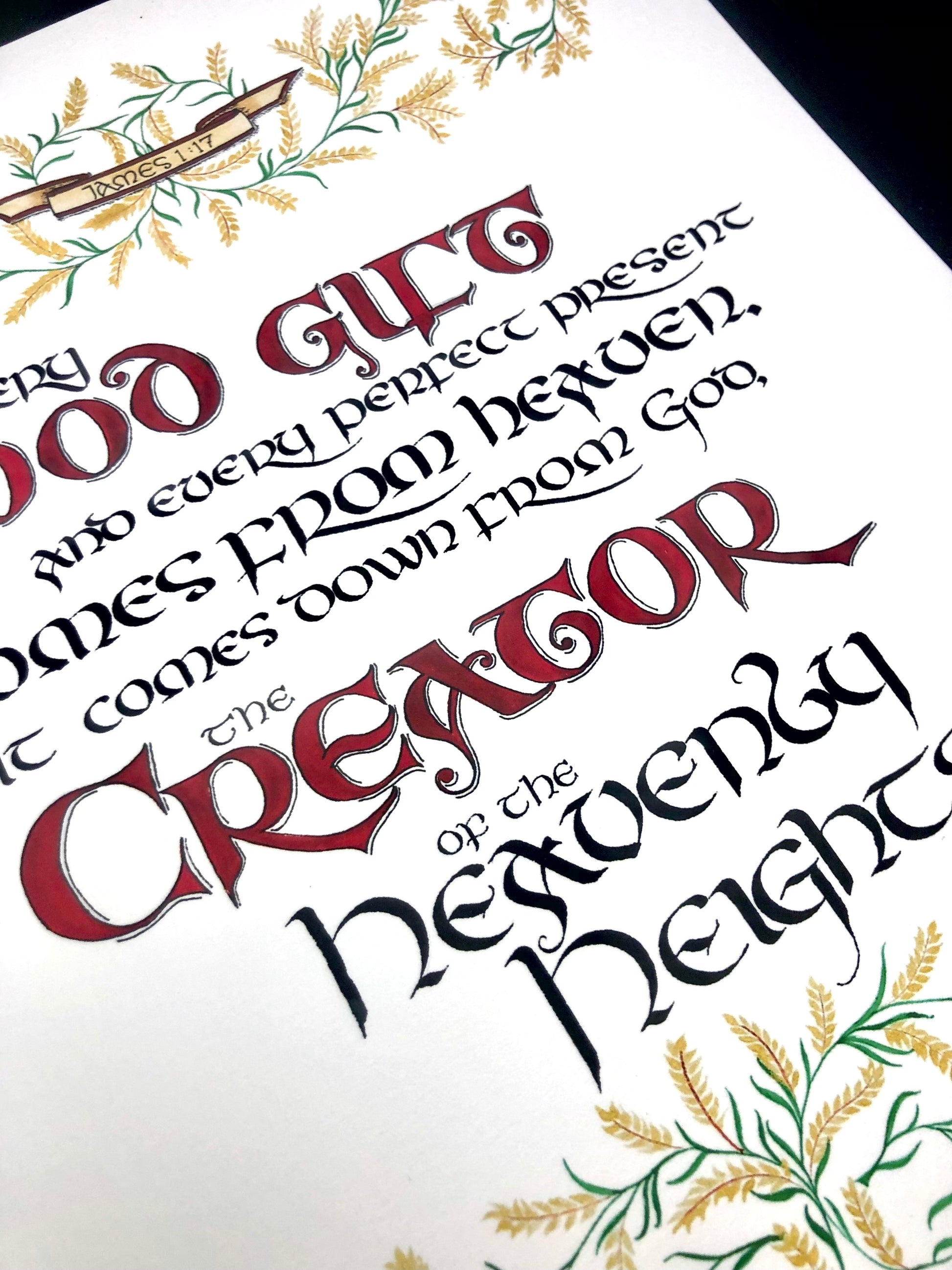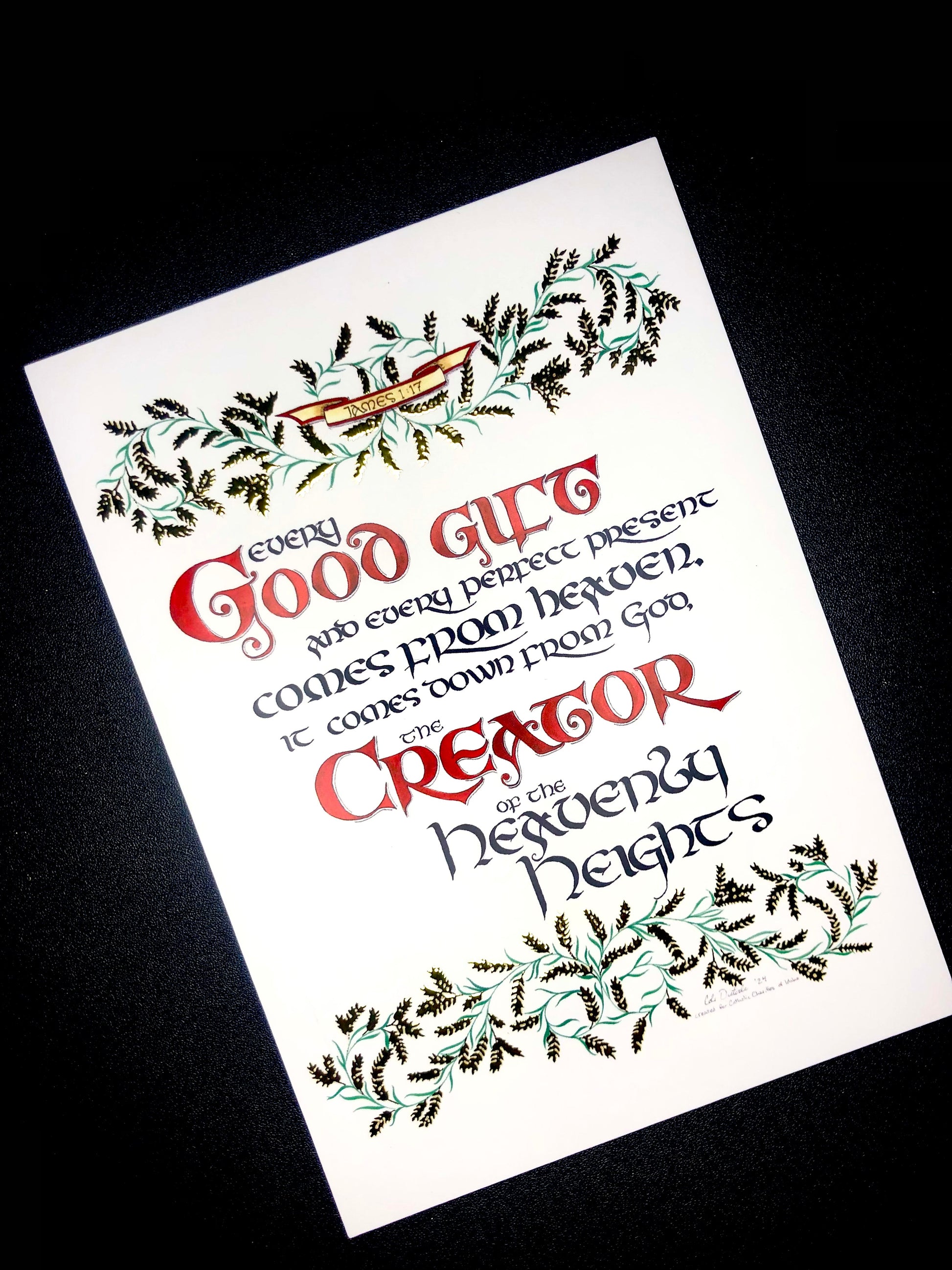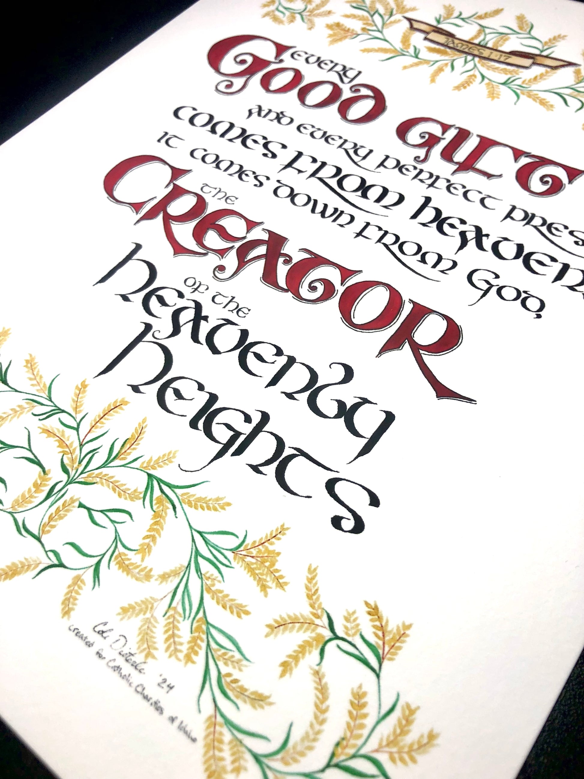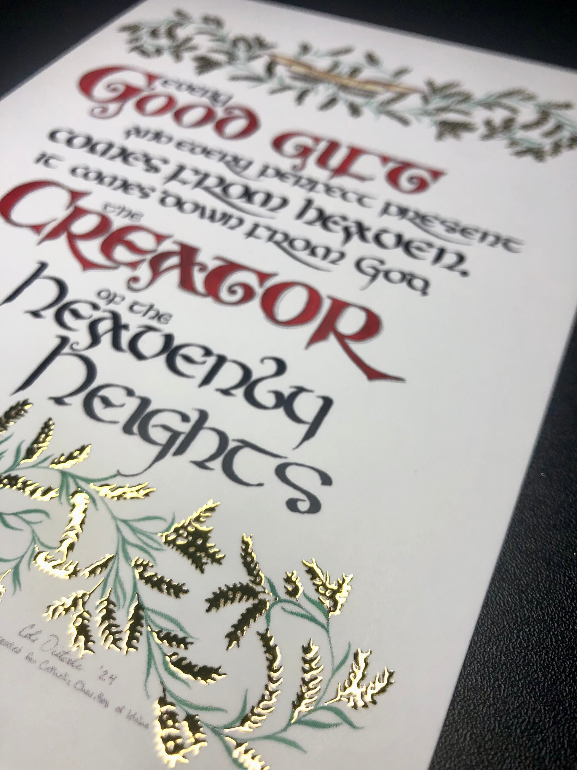 A reflection on divine providence and gratitude, "Good Gifts" was originally created for Catholic Charities of Idaho’s 2024 Harvest of Hope Gala. This illuminated print brings to life the words of James 1:17 in a style inspired by Celtic manuscripts, celebrating the abundance of God's blessings.