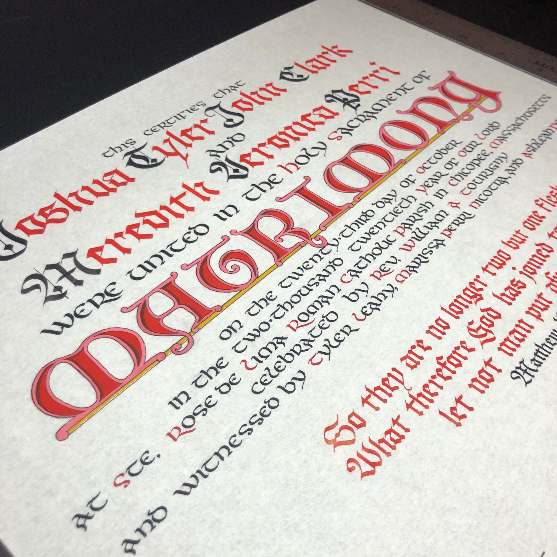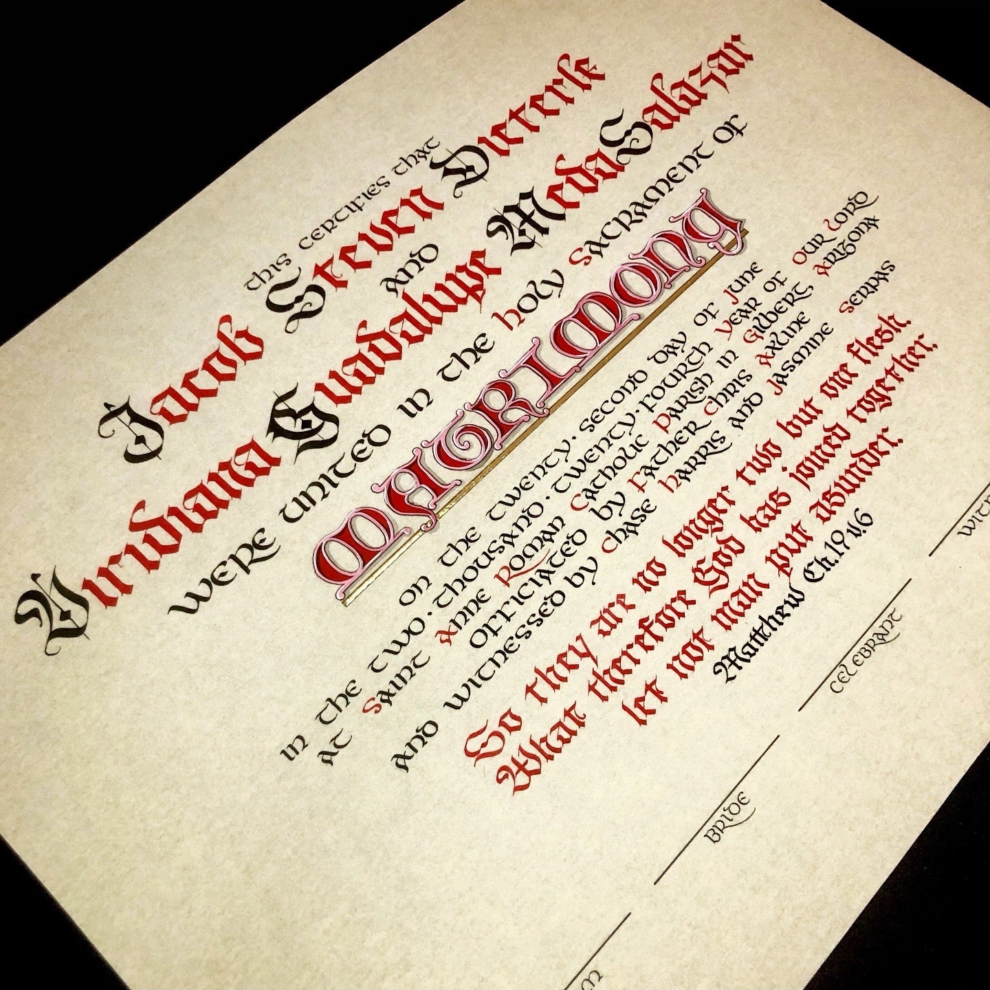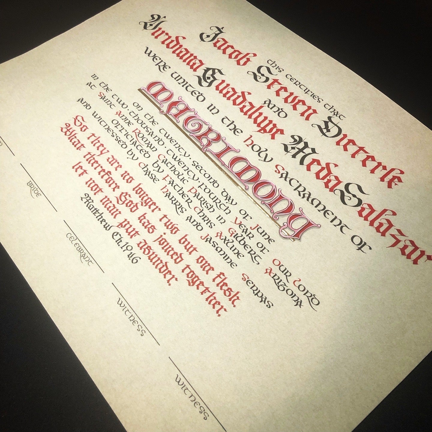 The available style is written in a mix of Gothic and uncial style scripts, with the title of the Sacrament (Matrimony) colorfully illuminated in large letters. The text of the certificate is accompanied by a simply written verse of Scripture, of your choice.