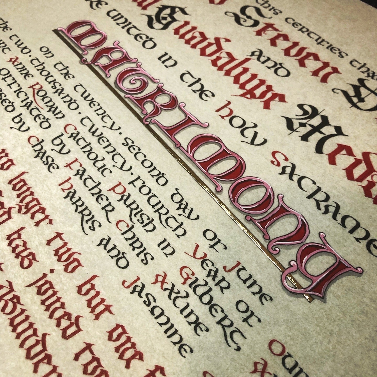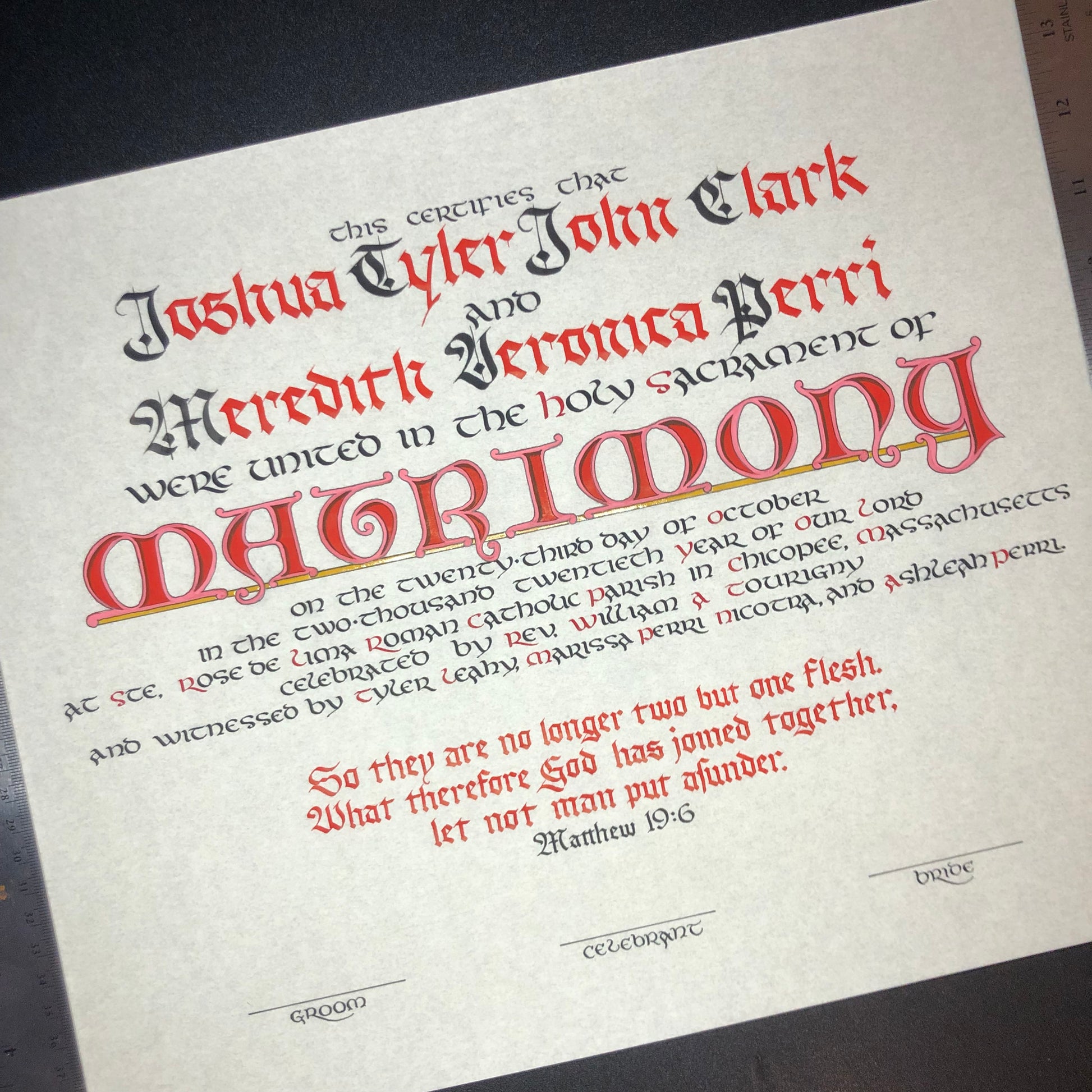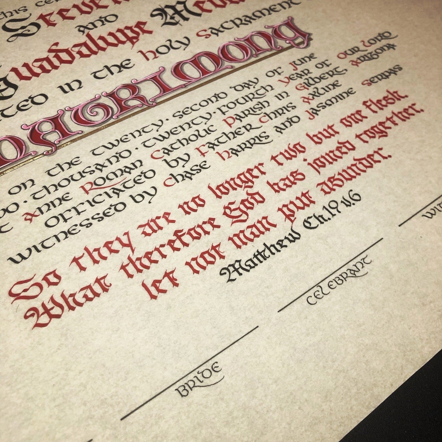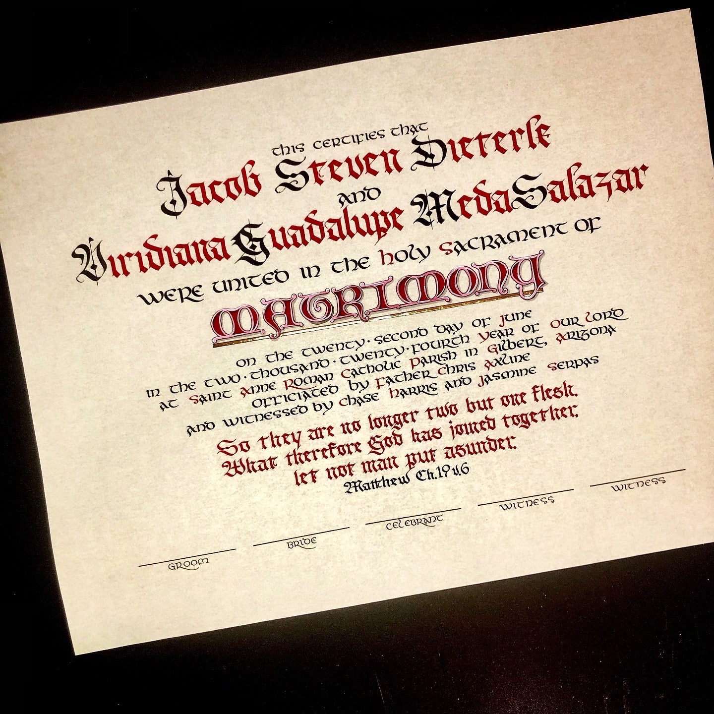 The available style is written in a mix of Gothic and uncial style scripts, with the title of the Sacrament (Matrimony) colorfully illuminated in large letters. The text of the certificate is accompanied by a simply written verse of Scripture, of your choice.