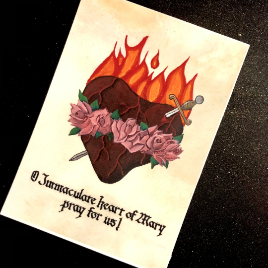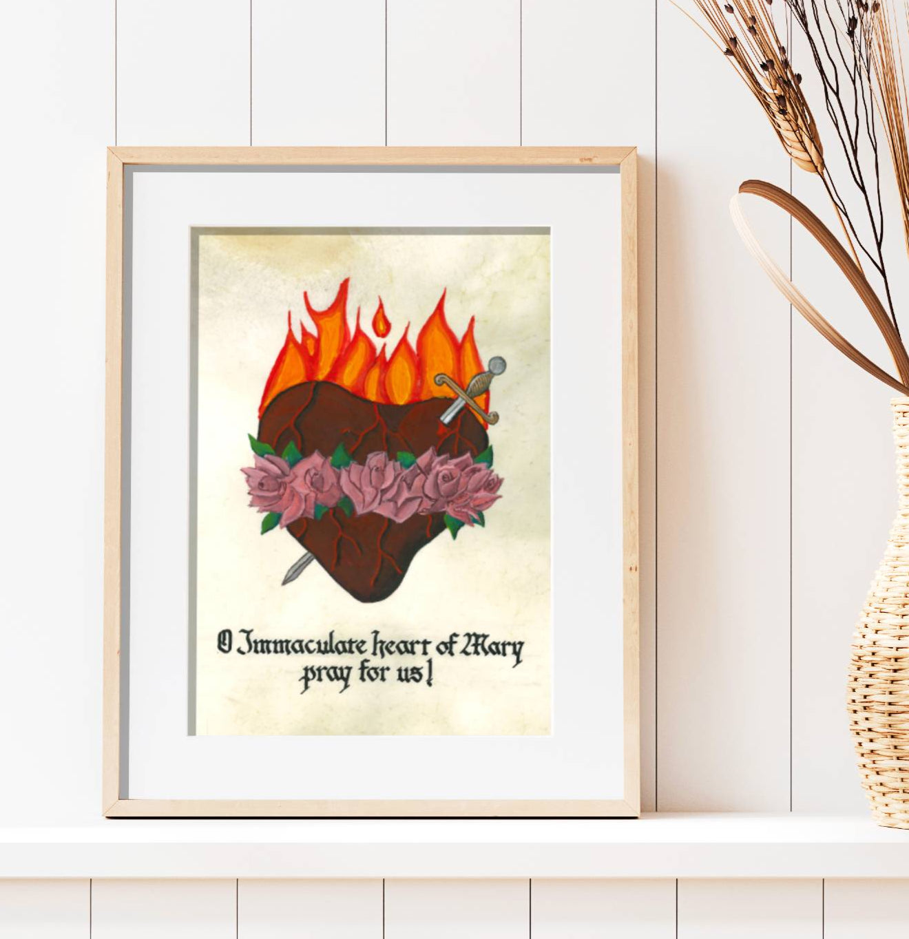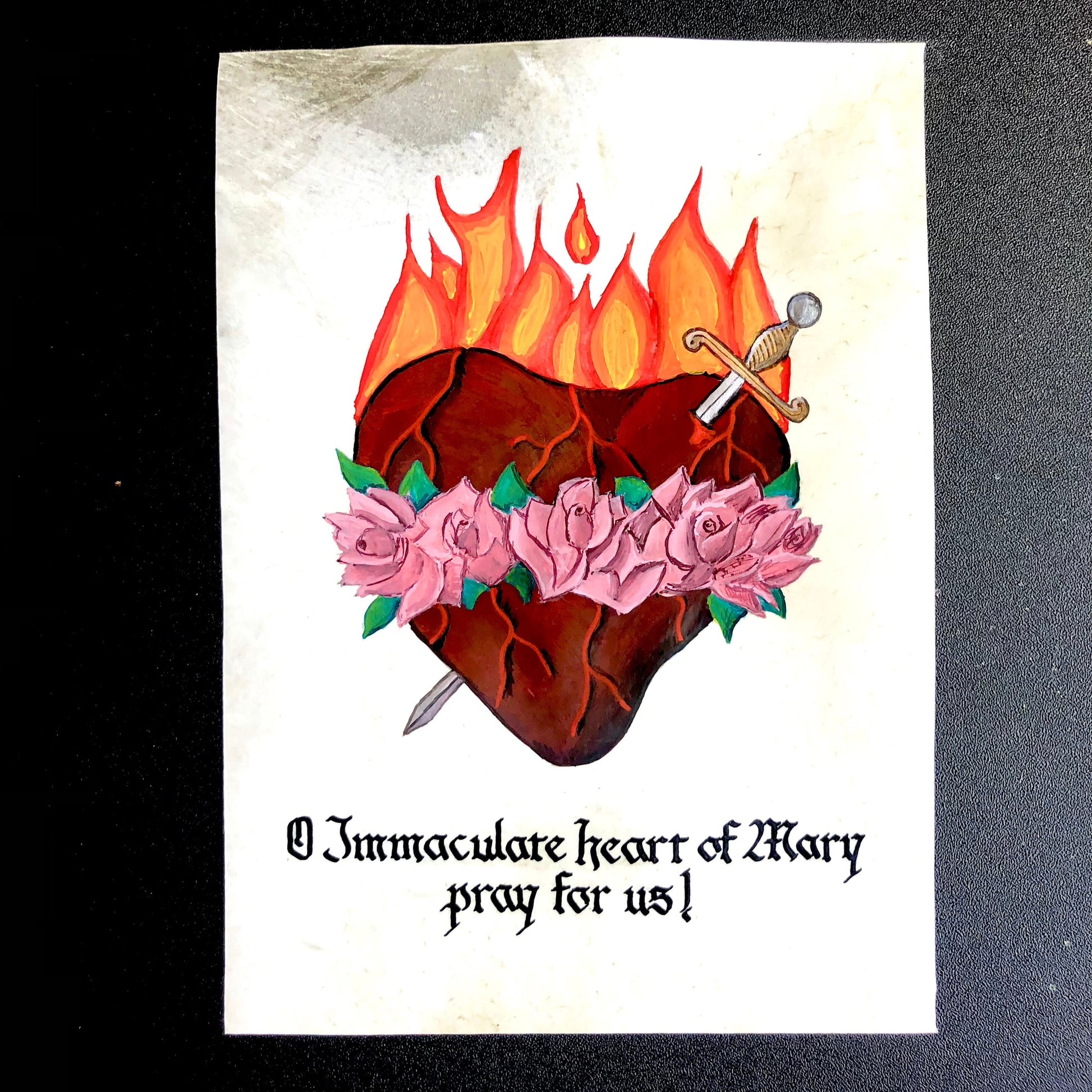 A high-fidelity 5x7" print of an original painting of the Immaculate Heart of Mary, by LettersToTheLord. The painting features traditional imagery and symbols associated with the Immaculate Heart, including a wreath of roses and a sword piercing the heart. At the bottom of the painting are the words "O Immaculate Heart of Mary, Pray for Us!", written in a Gothic style of calligraphy. The original was painted on genuine animal hide parchment.