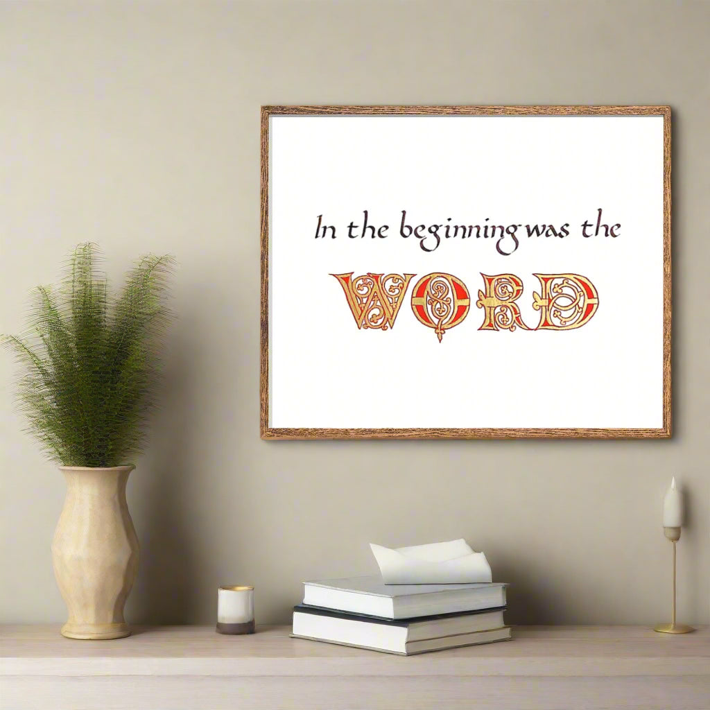 A beautiful, high-quality print of a simple original design of the first verse of the Gospel of John, this print is an excellent addition to any Christian home or office space. The text reads, "In the beginning was the WORD", focusing on the WORD - that is, Christ, the second divine person of the Trinity. 'WORD' is meticulously painted and illuminated in fine red and gold, with optional imitation or genuine gold leaf added by hand by the artist.