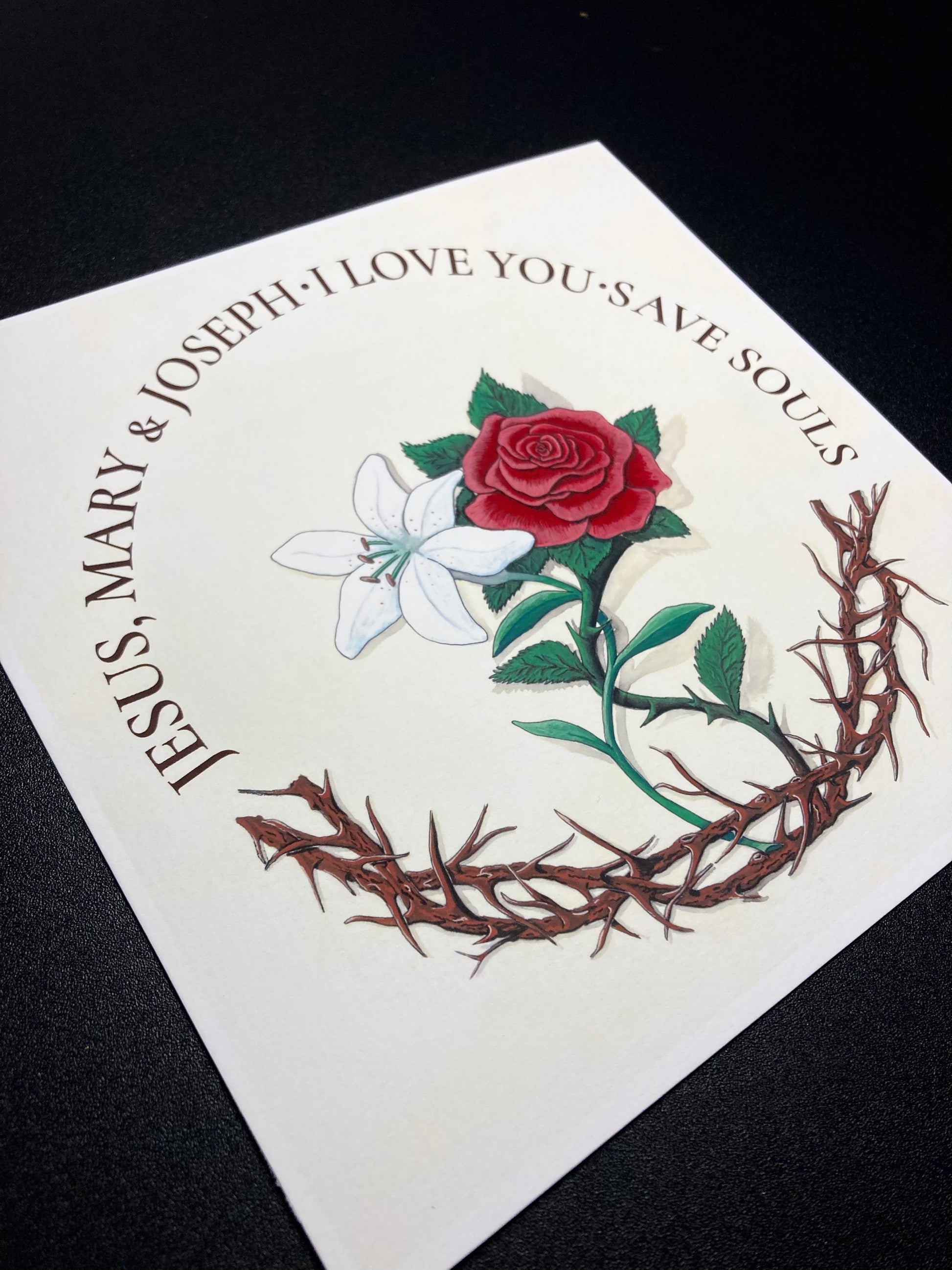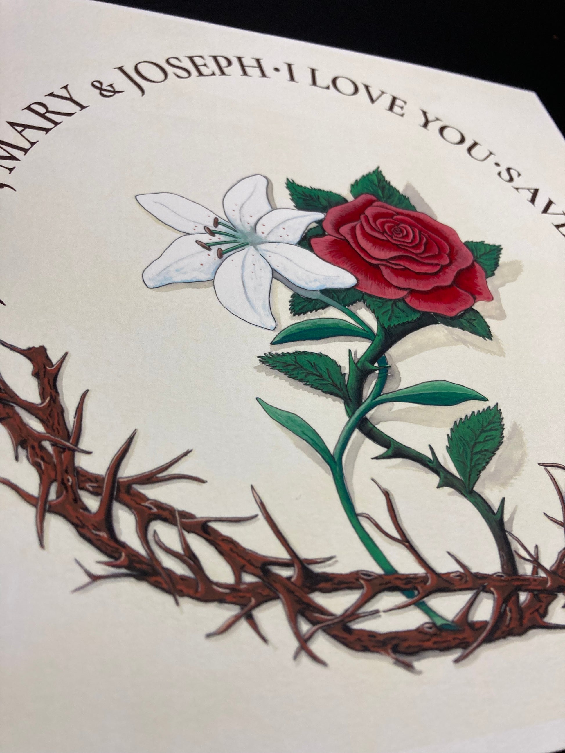 Dedicate your home to the Holy Family of Nazareth (Jesus, Mary, and Joseph) with this unique devotional artwork. In this illustration, Our Lord is represented by His Crown of Thorns; growing from this same wreath, Our Lady is firmly attached to her Son - a red rose in full bloom, representing both her love and her shared suffering in the Passion. Intertwined with the rose and thorns, a pure white lily represents St. Joseph, foster father of Our Lord.