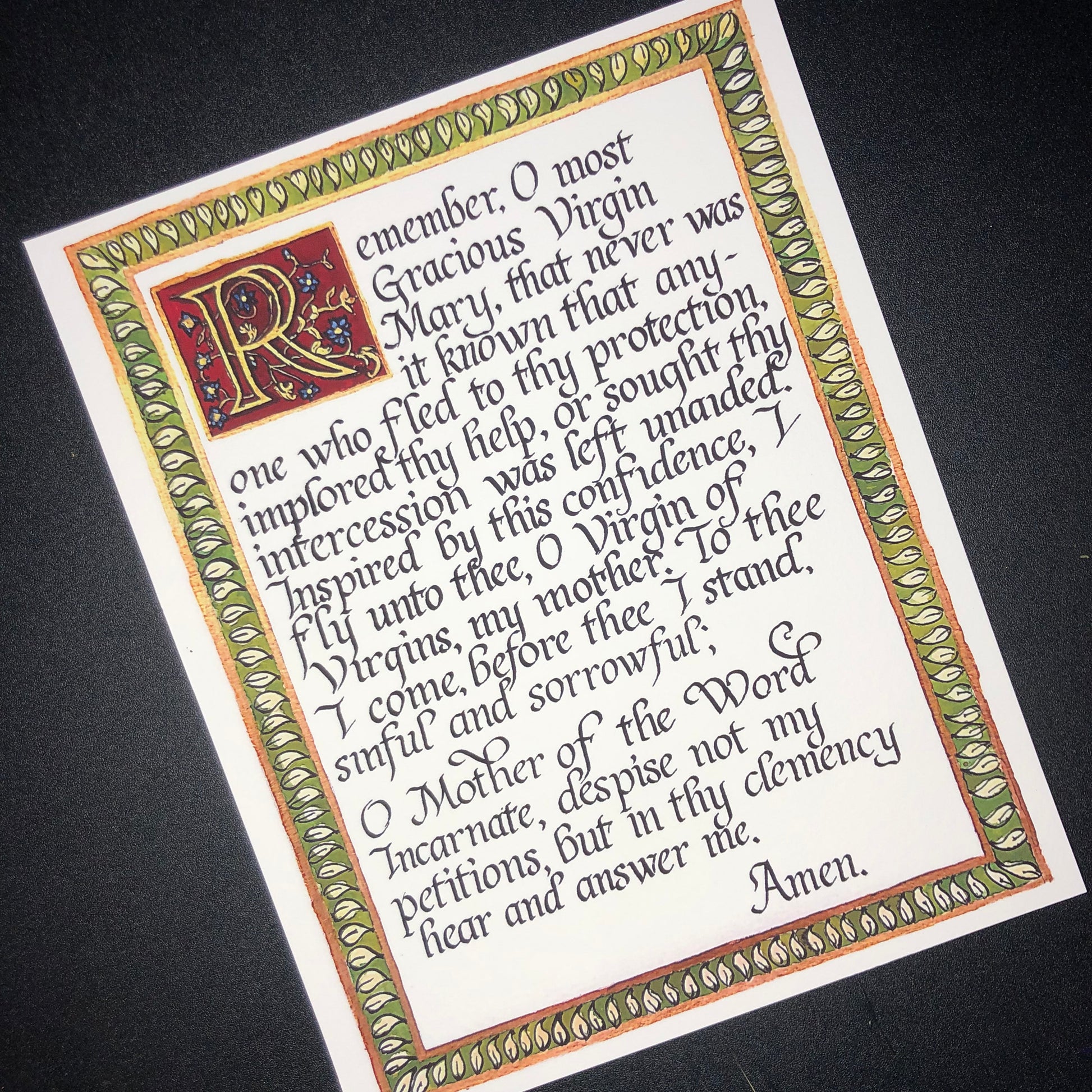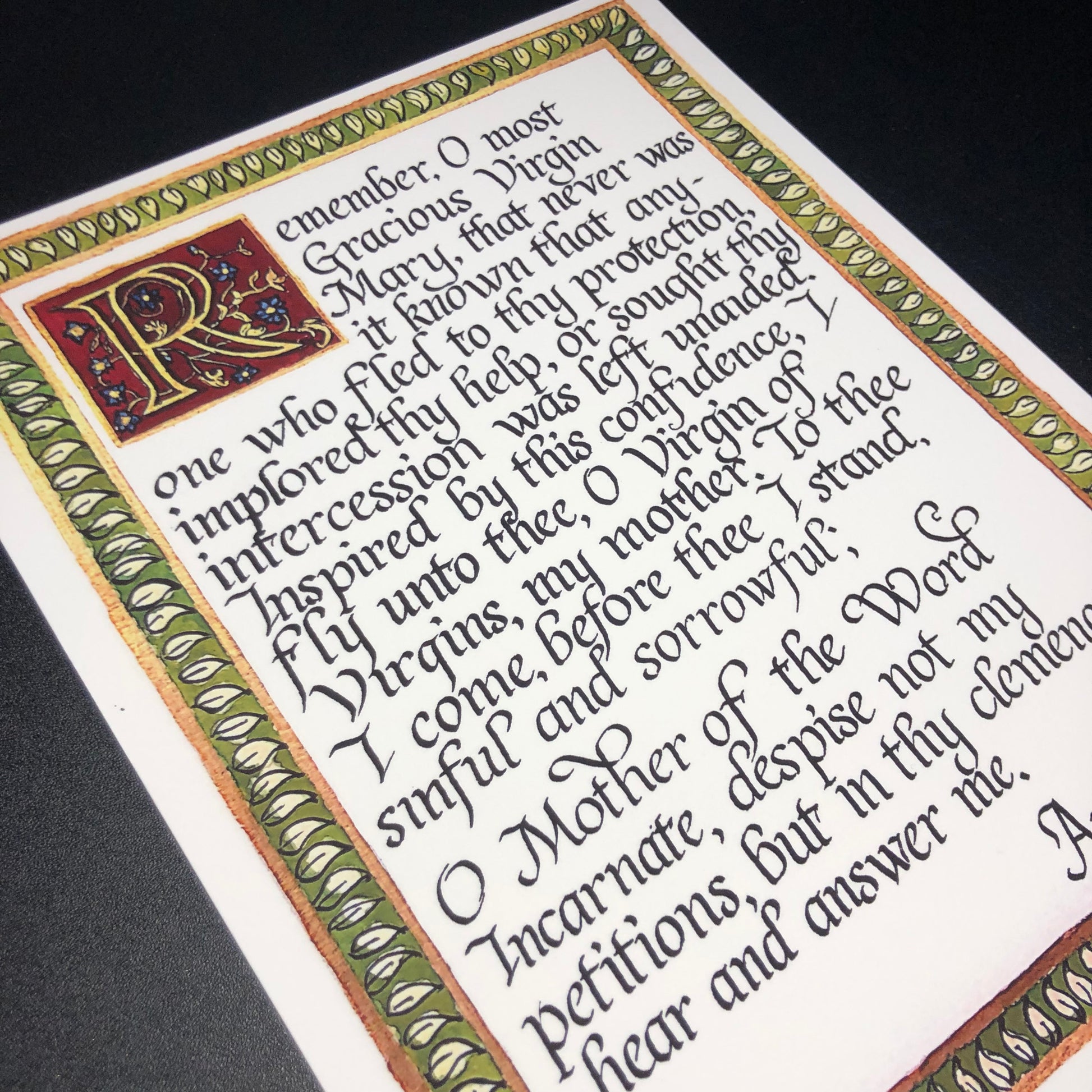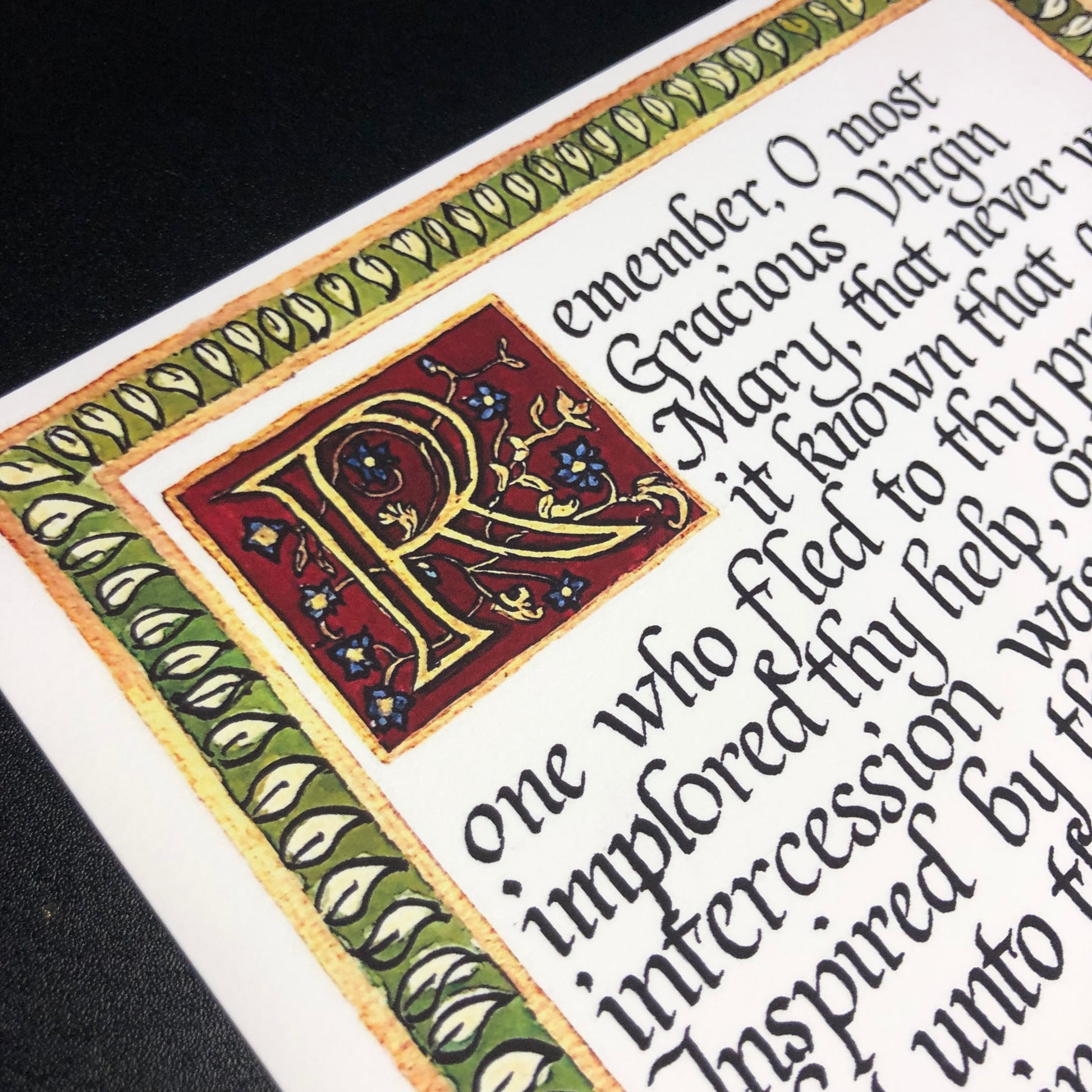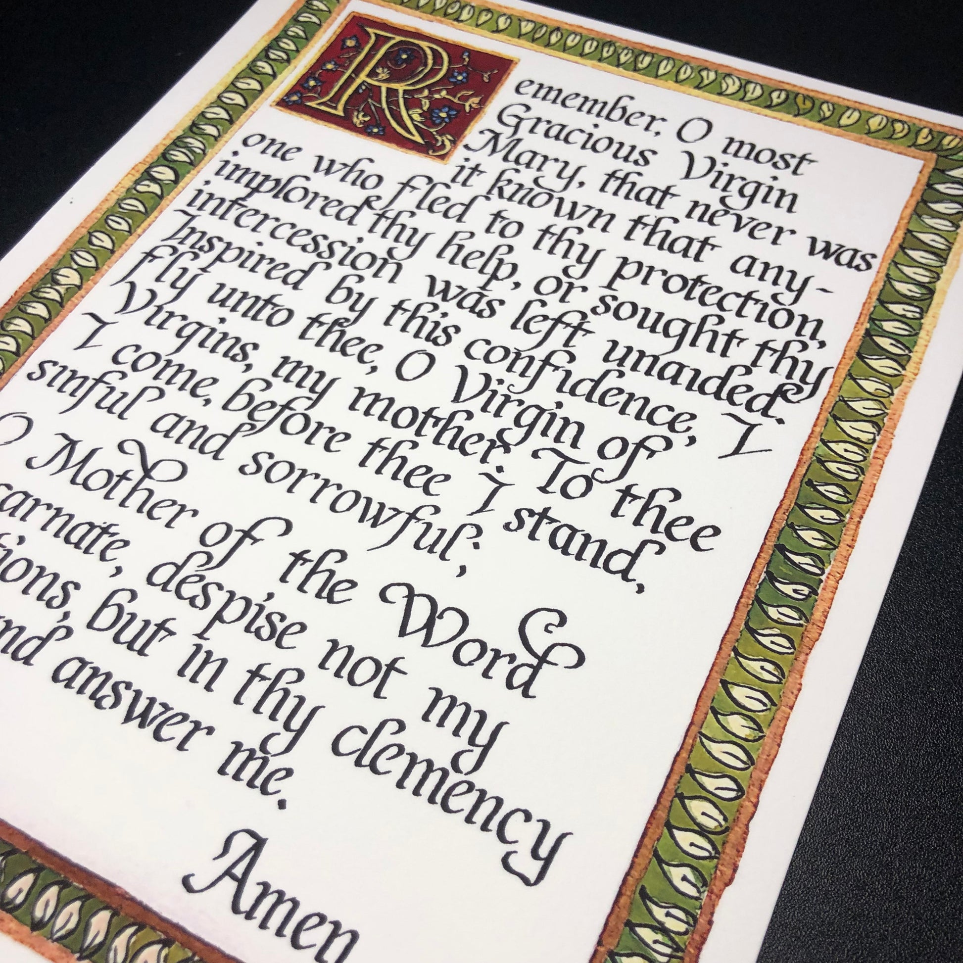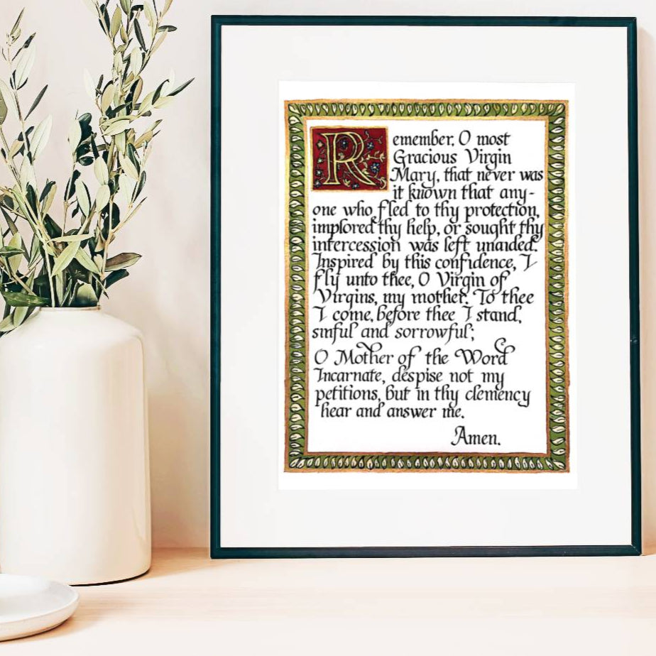 A print of the Memorare prayer (English) in a Neo-Classical/Italic style of calligraphy. This piece features a beautifully illuminated "R" set on a background of a deep burgundy, and a gold-framed border of simple leaves.