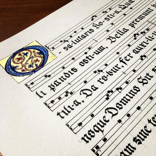 This piece features a beautifully detailed and illuminated “O” - in a Gothic style, painted with blue gouache and flourished with red vines. The versal is laid on a field of gold leaf.