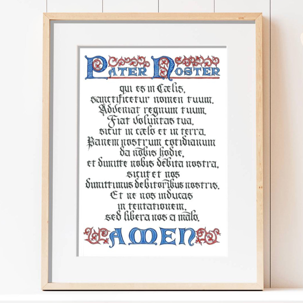 The 'Pater Noster' Prayer is presented in my signature Fraktur calligraphy style, matching the other prayers in the Our Lord and Lady Collection. Each letter is a work of art in itself, allowing us to draw closer to God, one letter at a time.