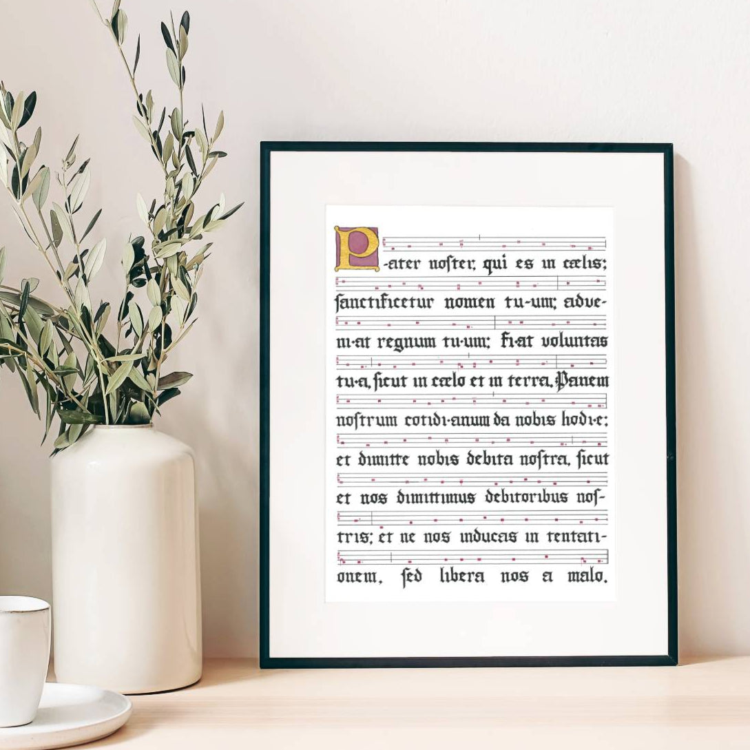 To sing is to pray twice - this simple, elegant copy of the Pater Noster (Our Father or The Lord's Prayer) chant is written and illuminated in a Gothic calligraphy style. The piece features a solid-gold versal 'P' backed with red. The music notes, called neumes for a piece of Gregorian chant, are drawn in the same red color. Imitation gold leaf can be added to the 'P' by hand for an additional visual brilliance.