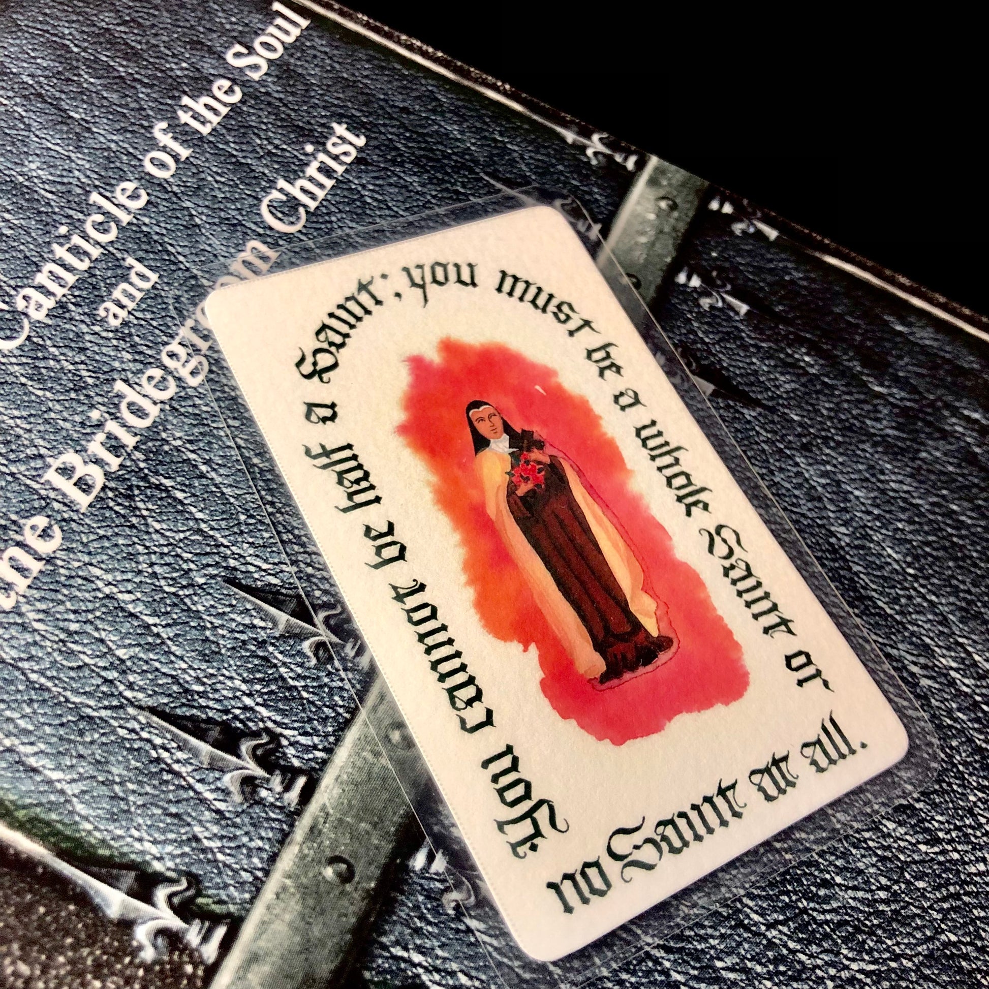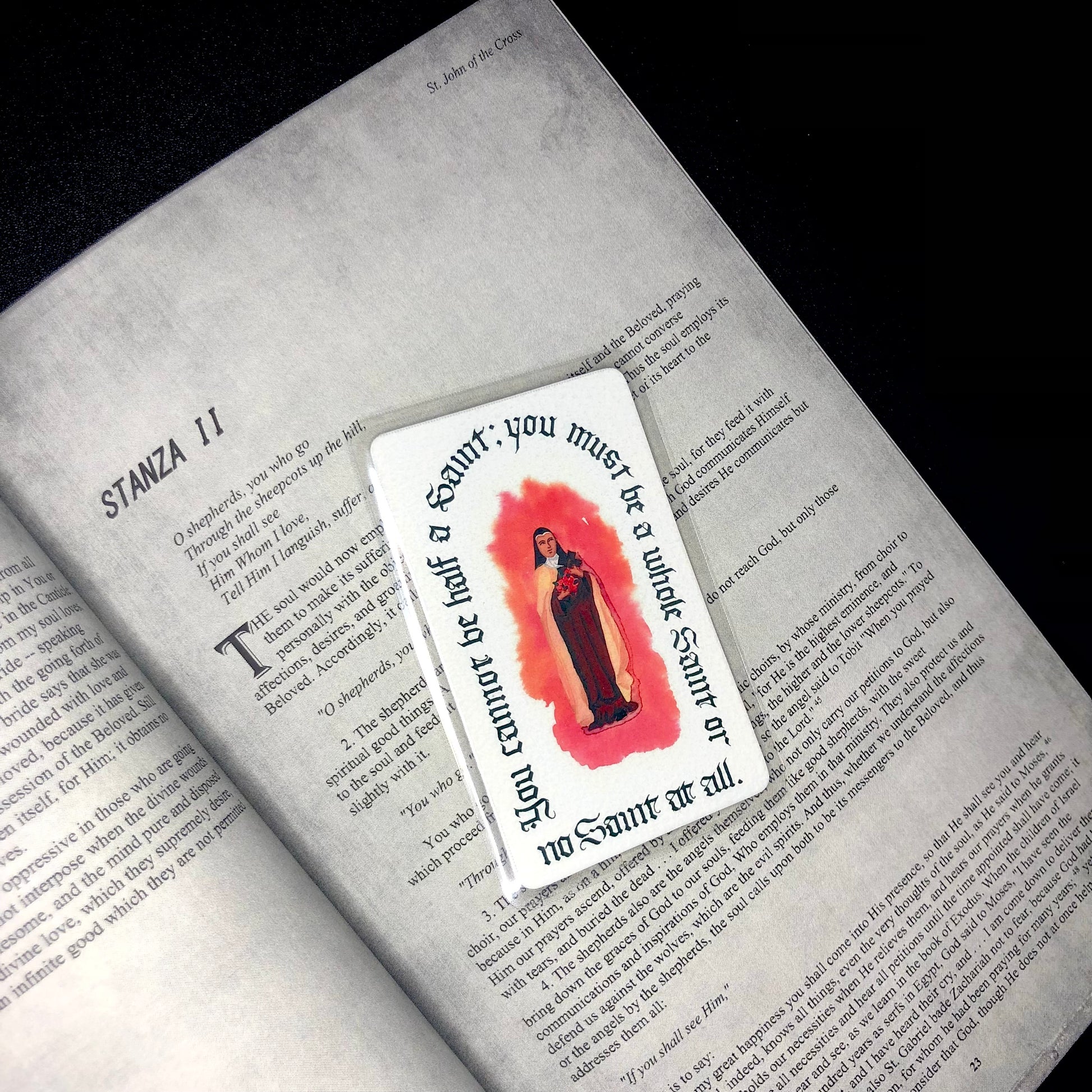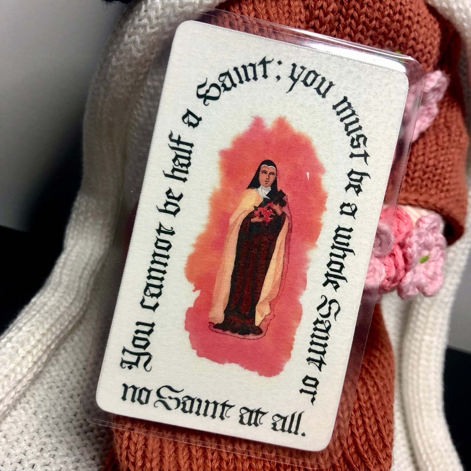 An adorable little bookmark or prayer card honoring our favorite Little Flower, St. Therese of Lisieux. Featuring a mini-illustration of the littlest Doctor of the Church and a quote, "One cannot be half a saint; one must be a whole Saint, or none at all."