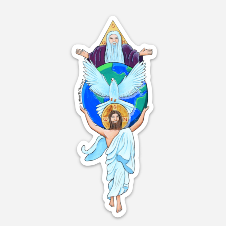 This Holy Trinity Sticker illustrates the Father as Creator of the World, the Son as the Risen Christ, and the Holy Spirit as a peaceful dove. This foundational Christian image is a must have to display you faith in His providence.