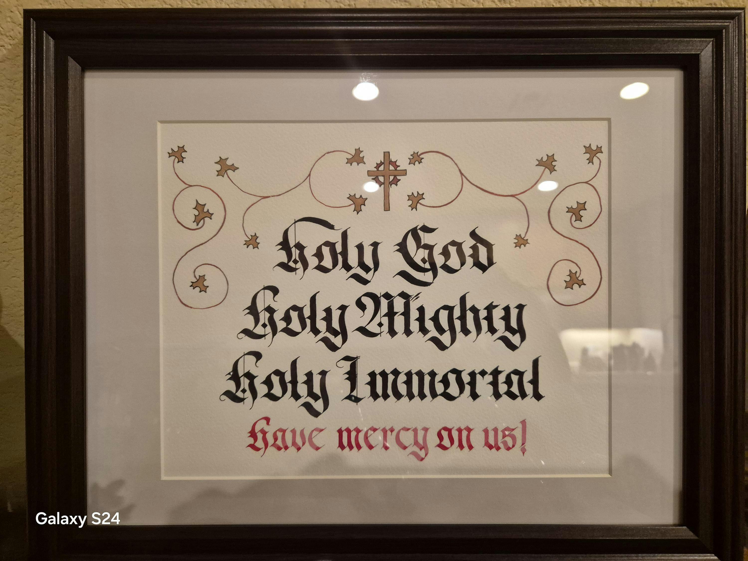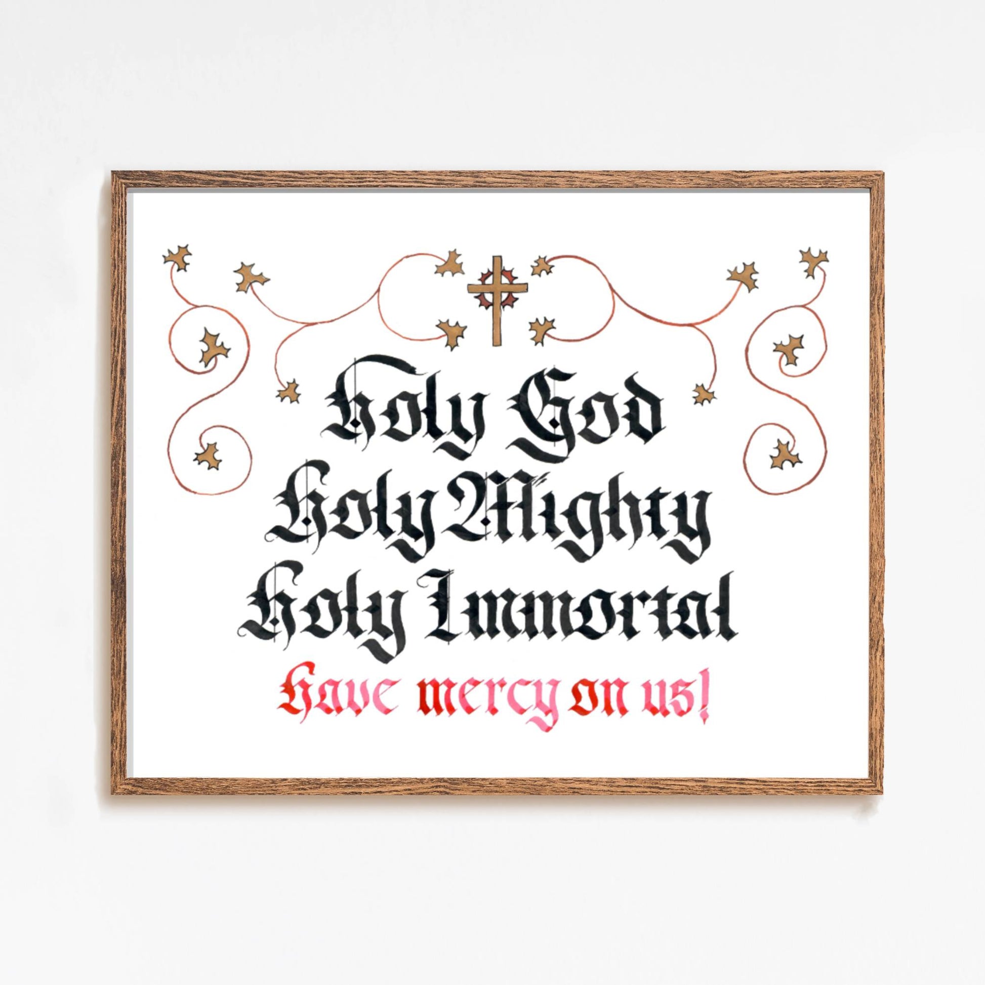 Grace your walls with ancient devotion with our "Trisagion" Print, a work of Fraktur calligraphy that beautifully renders the sacred prayer, "Holy God, Holy Mighty, Holy Immortal; Have Mercy On Us!" This timeless prayer has its roots in early Christian tradition and has been a steadfast expression of worship for centuries.