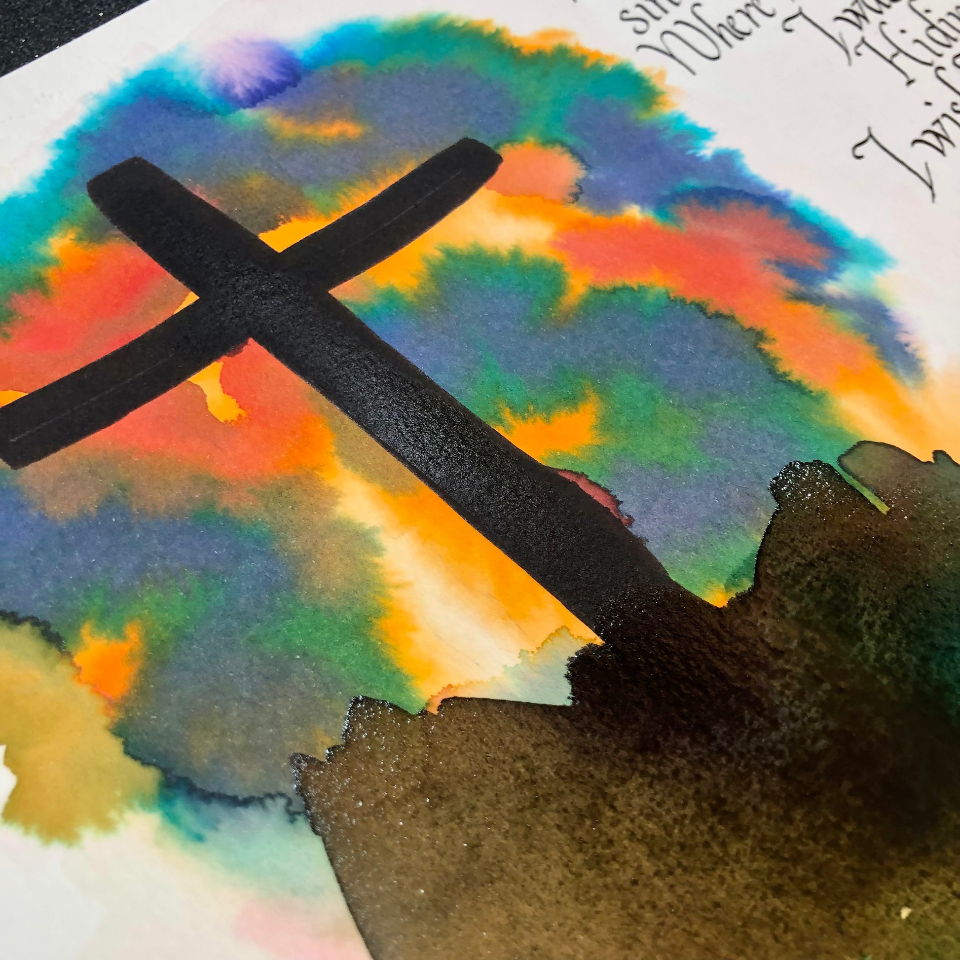 🎨 Watercolor Cross Silhouette 🎨 Accompanying the profound words is a watercolor illustration of a cross silhouette, symbolizing the transformative power of Christ's sacrifice. The gentle strokes of color add a touch of serenity and grace to the overall composition, creating a harmonious visual experience.